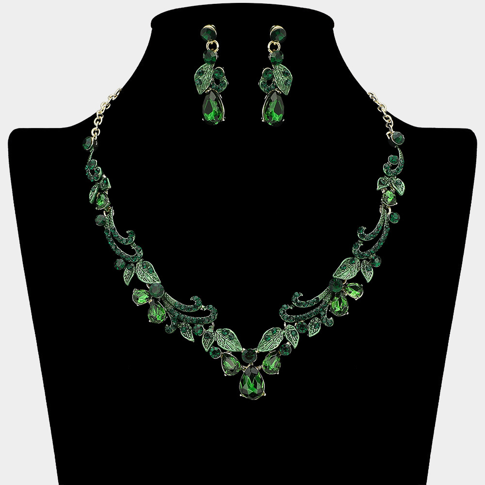 Details • Necklace Size : 17.5" + 3" L • Decor Size : 0.8" L • Earrings Size : 1.6" L • Dazzling necklace and earring set featuring teardrop crystals with intricate leaf accents. Perfect for weddings, pageants, or evening events, this set adds a refined and elegant touch to any special occasion look.