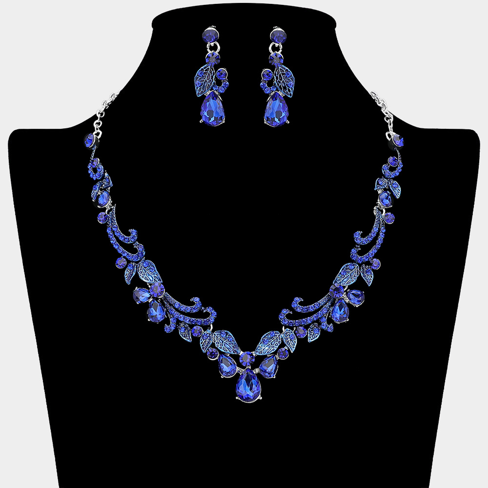 • Dazzling necklace and earring set featuring teardrop crystals with intricate leaf accents. Perfect for weddings, pageants, or evening events, this set adds a refined and elegant touch to any special occasion look.