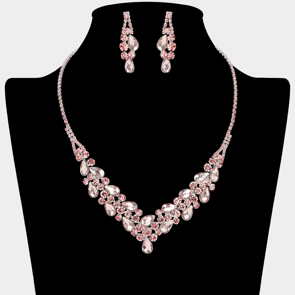 Details • Necklace Size : 17.5" + 5" L • Decor Size : 1" L • Earrings Size : 1.5" L • Elegant jewelry set featuring a rhinestone-encrusted necklace and matching earrings with teardrop-shaped accents. Designed to shine at formal events, weddings, or special evenings, this set adds glamour and sophistication with its detailed sparkle and refined silhouette.