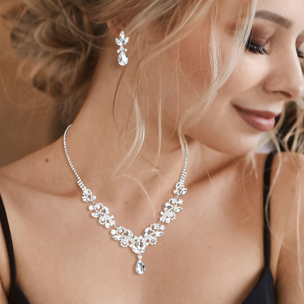 • Graceful floral teardrop rhinestone necklace and earring set featuring sparkling clustered stones with a delicate drop pendant. Ideal for brides, proms, and evening occasions, this jewelry set radiates sophistication and timeless charm for a flawless, glamorous finish.