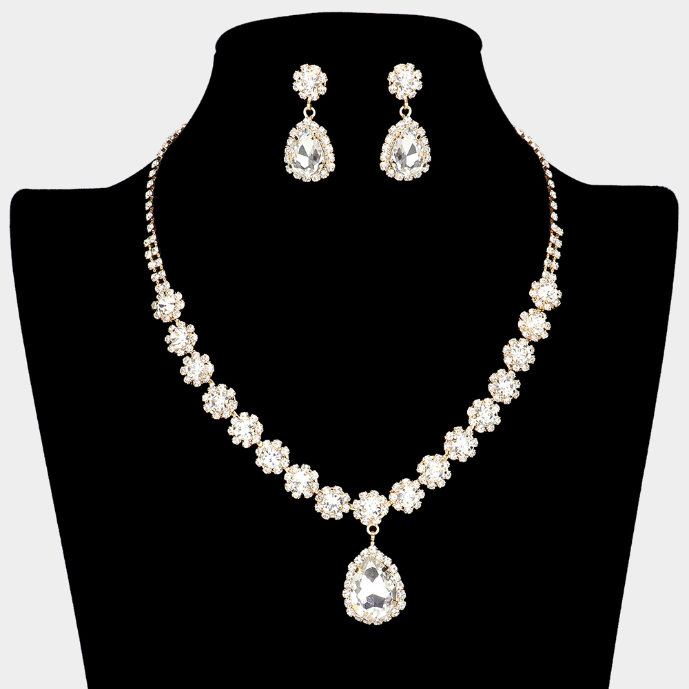 Teardrop Stone Pointed Flower Rhinestone Paved Necklace
