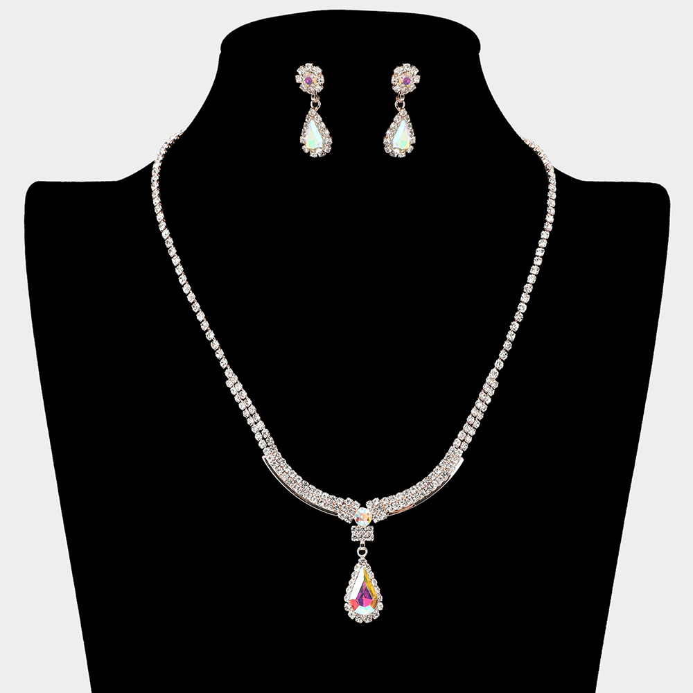 Details • Necklace Size : 16" + 4" L • Decor Size : 1.4" L • Earrings Size : 1.1" L • Add a touch of sparkle with this refined teardrop rhinestone necklace and earring set. Perfect for weddings, formal events, and special evenings where elegance and shine take center stage.