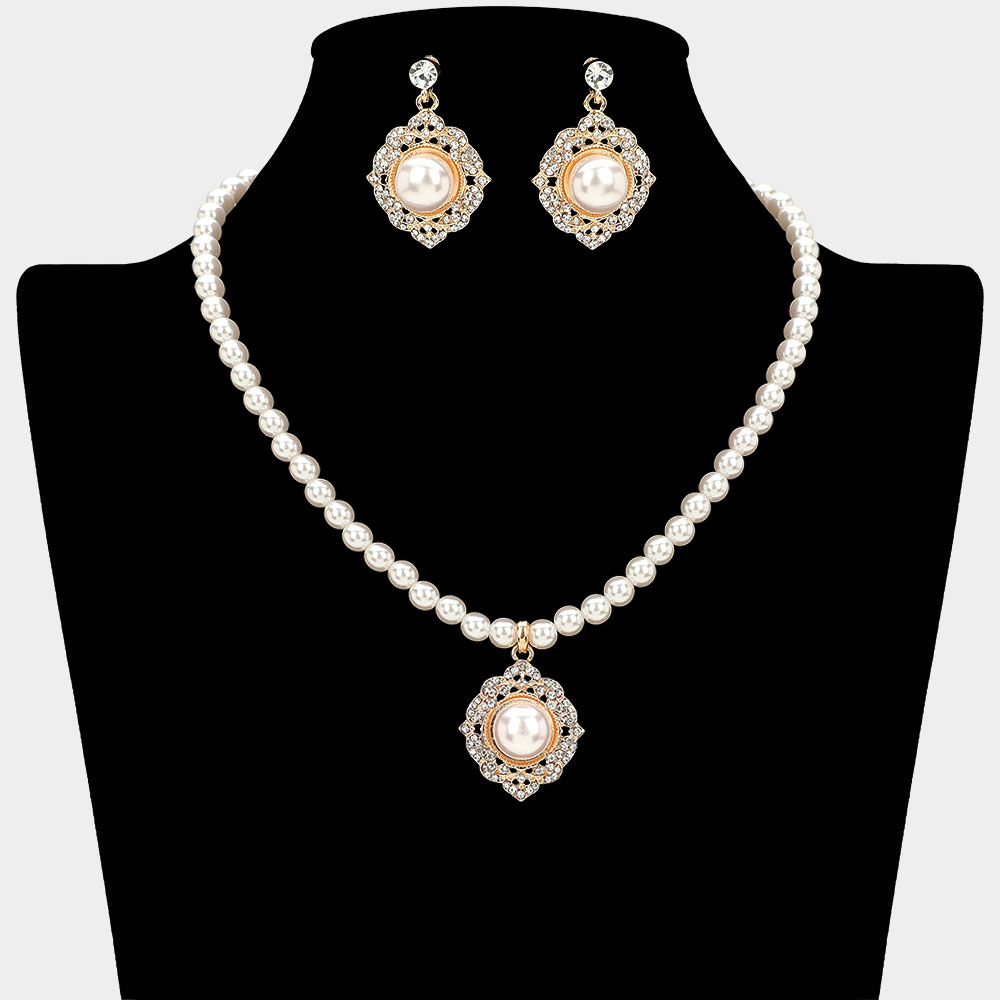 • Elegant pearl necklace and earring set with vintage-inspired round pendants and crystal detailing. Ideal for weddings, parties, or formal events, this classic set adds timeless charm to any look.