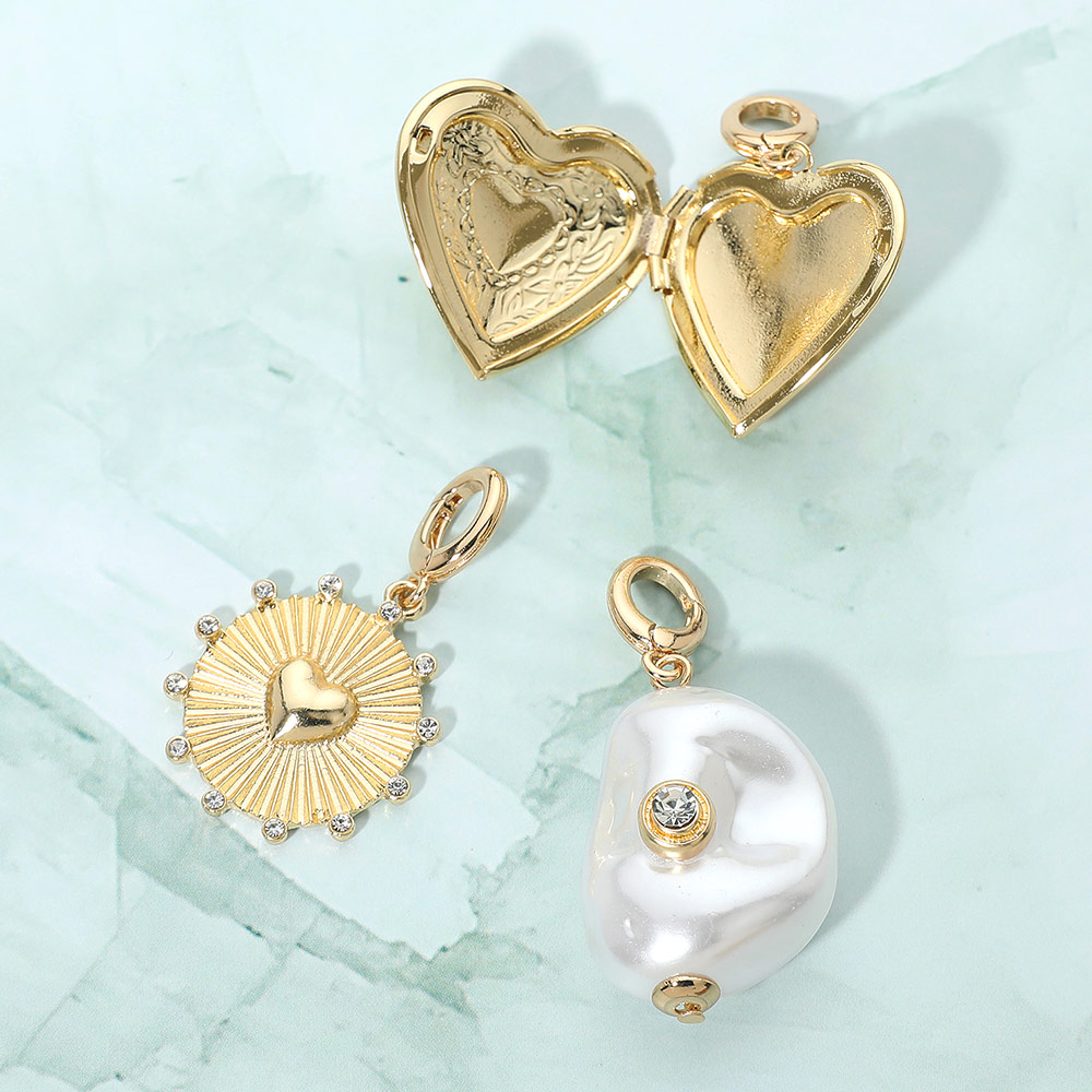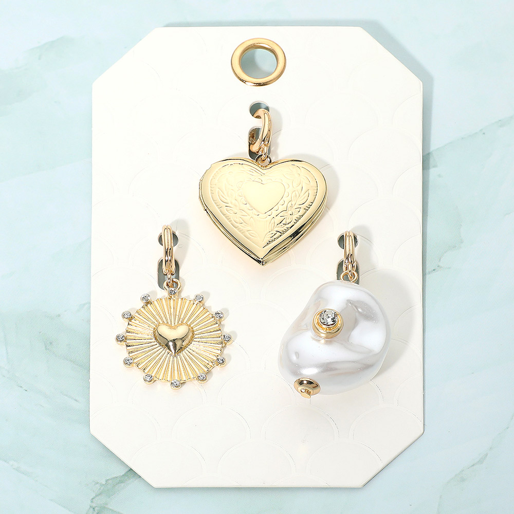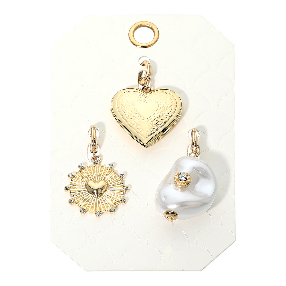 Details • Size : 1.6" - 2"L • Elevate any accessory with this charm pendant set featuring a heart locket, a radiant heart embossed medallion, and an abstract stone accent pearl piece. Designed for easy mixing and matching, these pendants add a touch of personality and style to bracelets, necklaces, or keychains for versatile everyday wear.