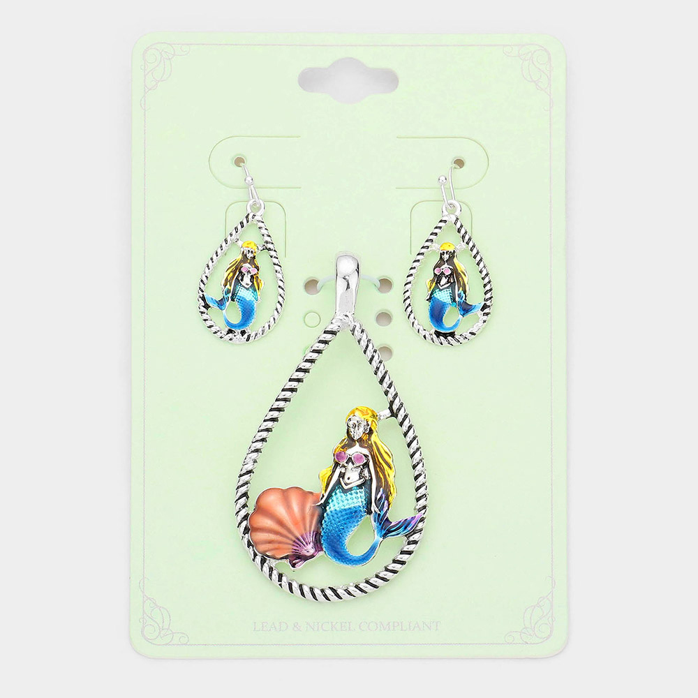 Enamel Mermaid Shell Accented Open Teardrop Pendant Set