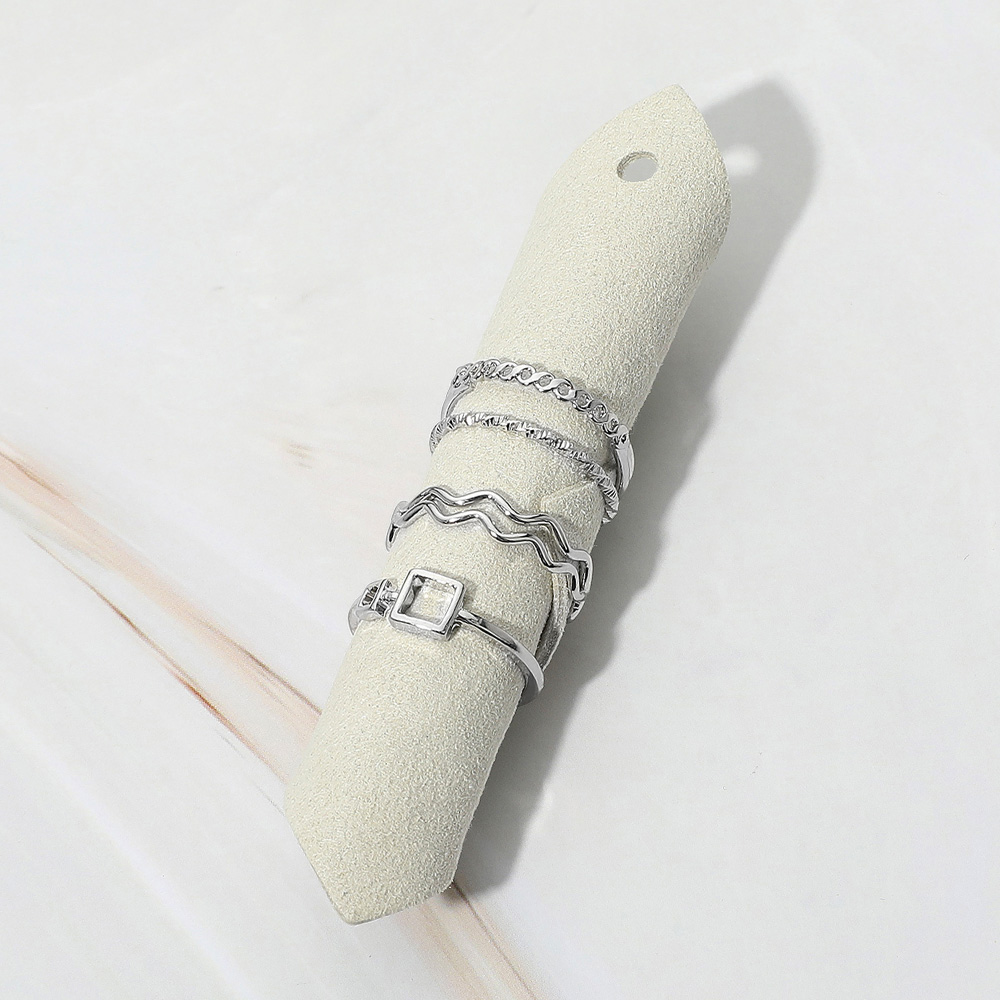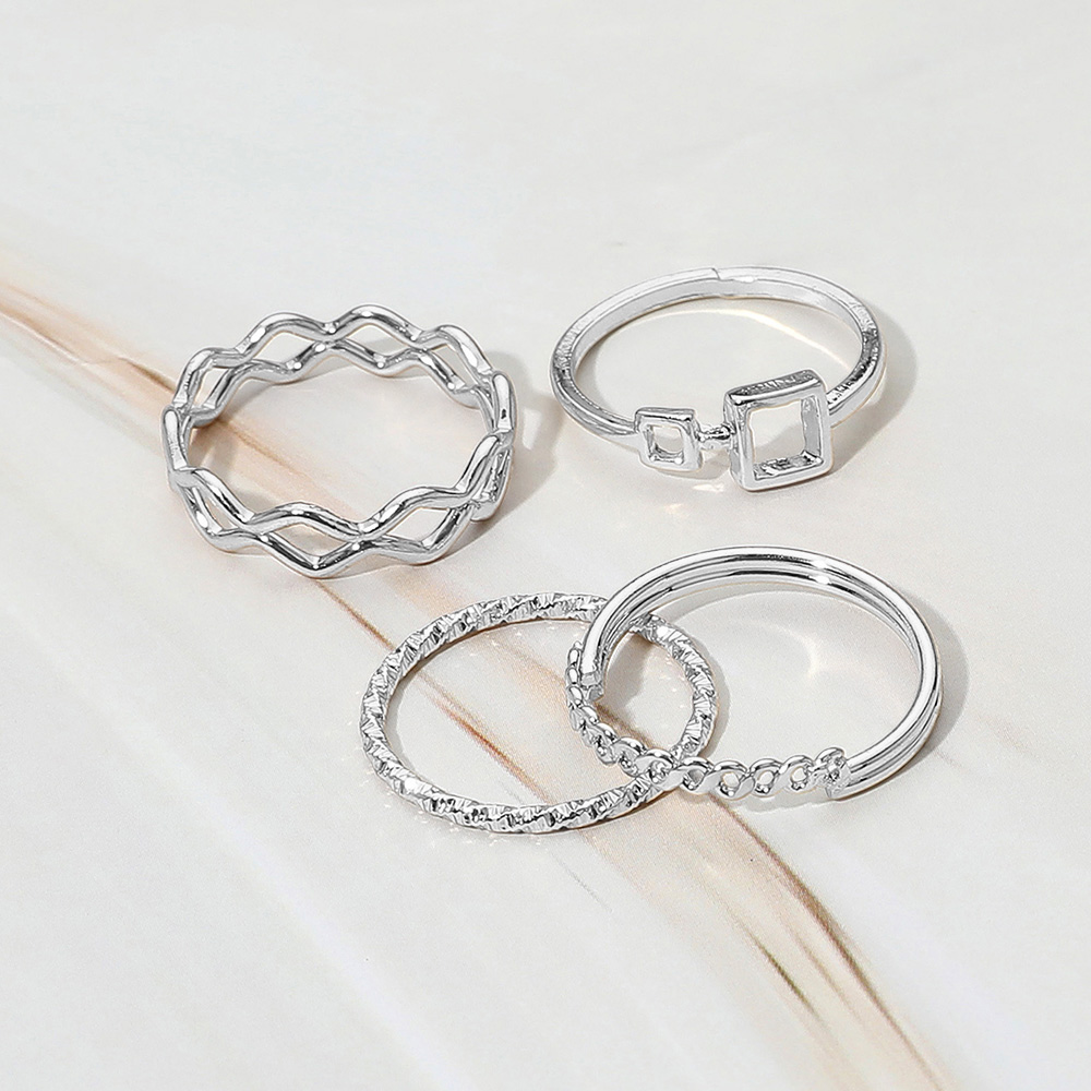 Details • Size : 0.1" - 0.25" H • Size 7 Only • This set of four stackable rings showcases a mix of geometric and textured designs, including chain links, zigzag patterns, and buckle accents. Perfect for layering or wearing individually, they add a versatile touch of modern elegance to any jewelry collection. • Lead and Nickel Compliant