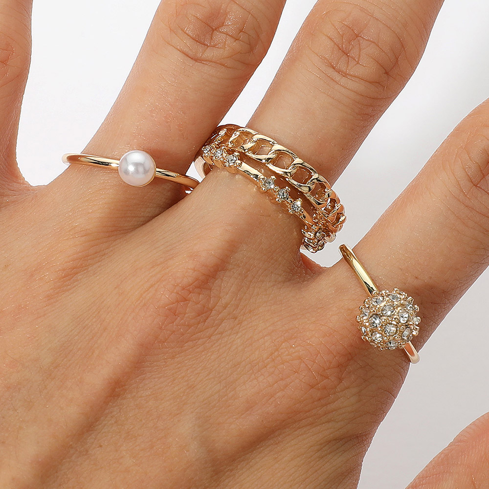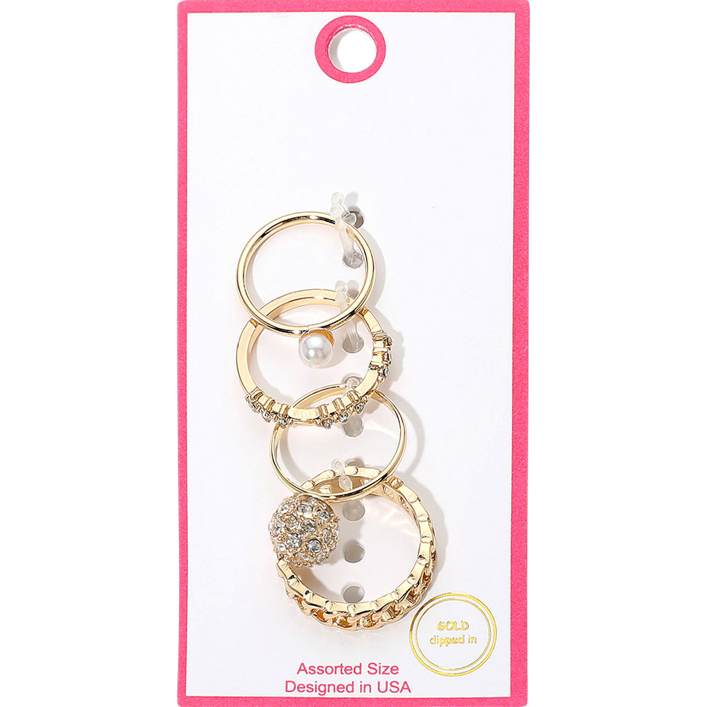 Details • Size : 0.1" - 0.3" H • Size 7 Only • Chic 4-piece ring set featuring crystal accents, faux pearl, and textured bands. Ideal for stacking or wearing individually. Adds a touch of elegance and sparkle to casual or formal outfits.