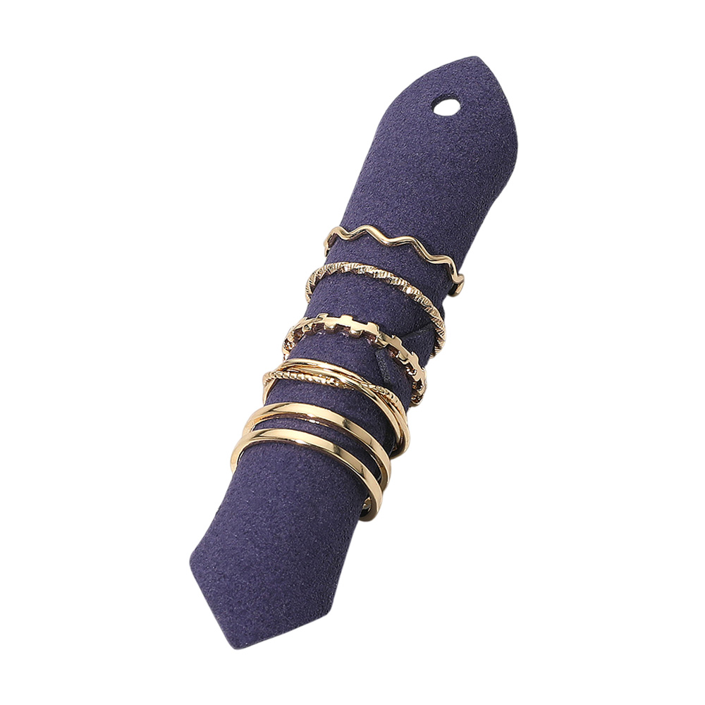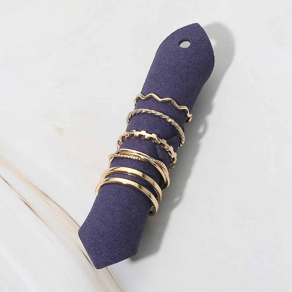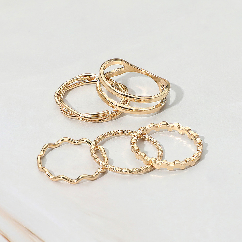 • This set of five stackable rings features a variety of minimalist designs, from wavy and textured bands to sleek, smooth styles. Perfect for layering or wearing alone, they offer versatile elegance that complements both casual and sophisticated outfits.