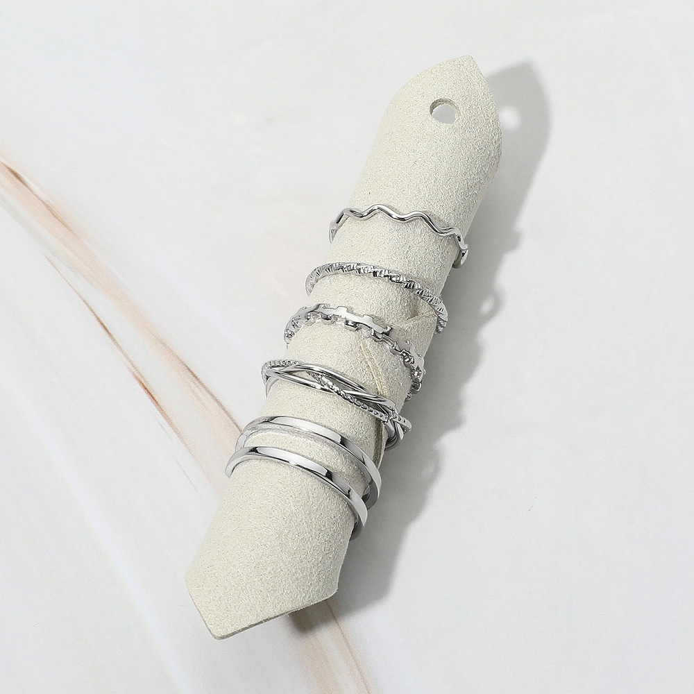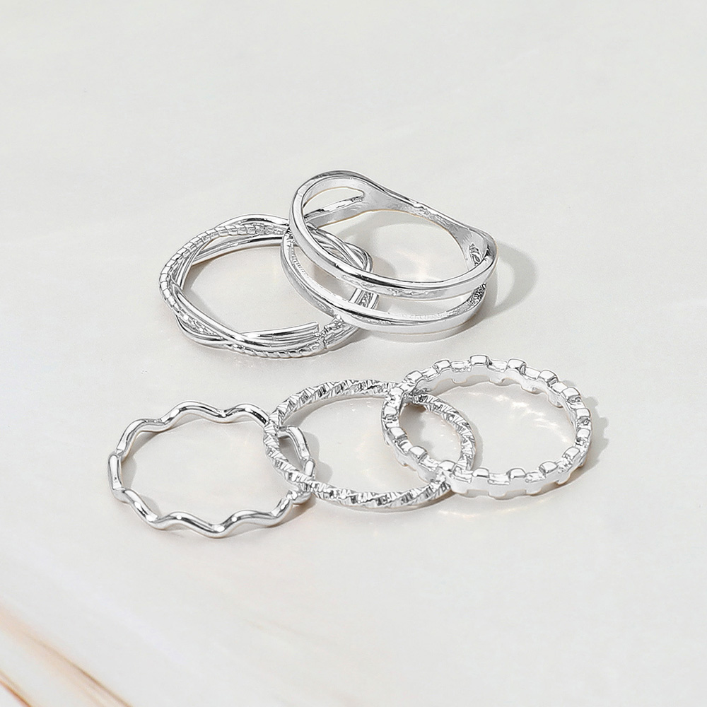 Details • Size : 0.1" - 0.3" H • Size 7 Only • This set of five stackable rings features a variety of minimalist designs, from wavy and textured bands to sleek, smooth styles. Perfect for layering or wearing alone, they offer versatile elegance that complements both casual and sophisticated outfits. • Lead and Nickel Compliant