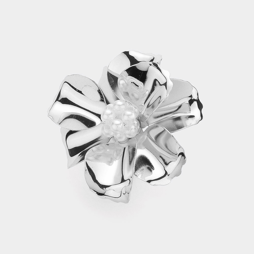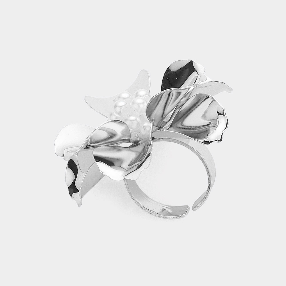Beaded Ball Center Metal Petal Flower Adjustable Ring