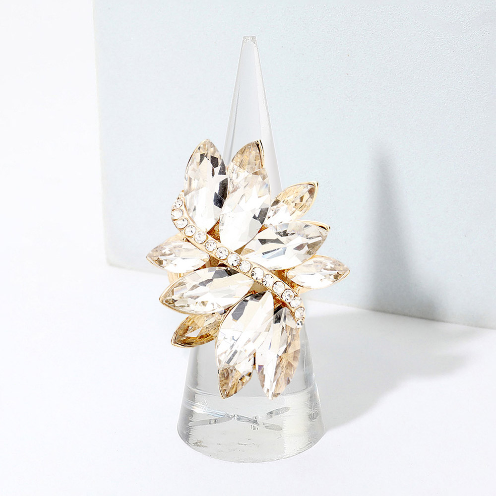 Details • Size : 1" X 1.5" • Stretchable • Shine bright with a statement cocktail ring designed in a striking crystal leaf motif. Featuring multi-faceted stones and dazzling sparkle, this glamorous accessory is perfect for parties, special occasions, or elevating everyday outfits with bold elegance.