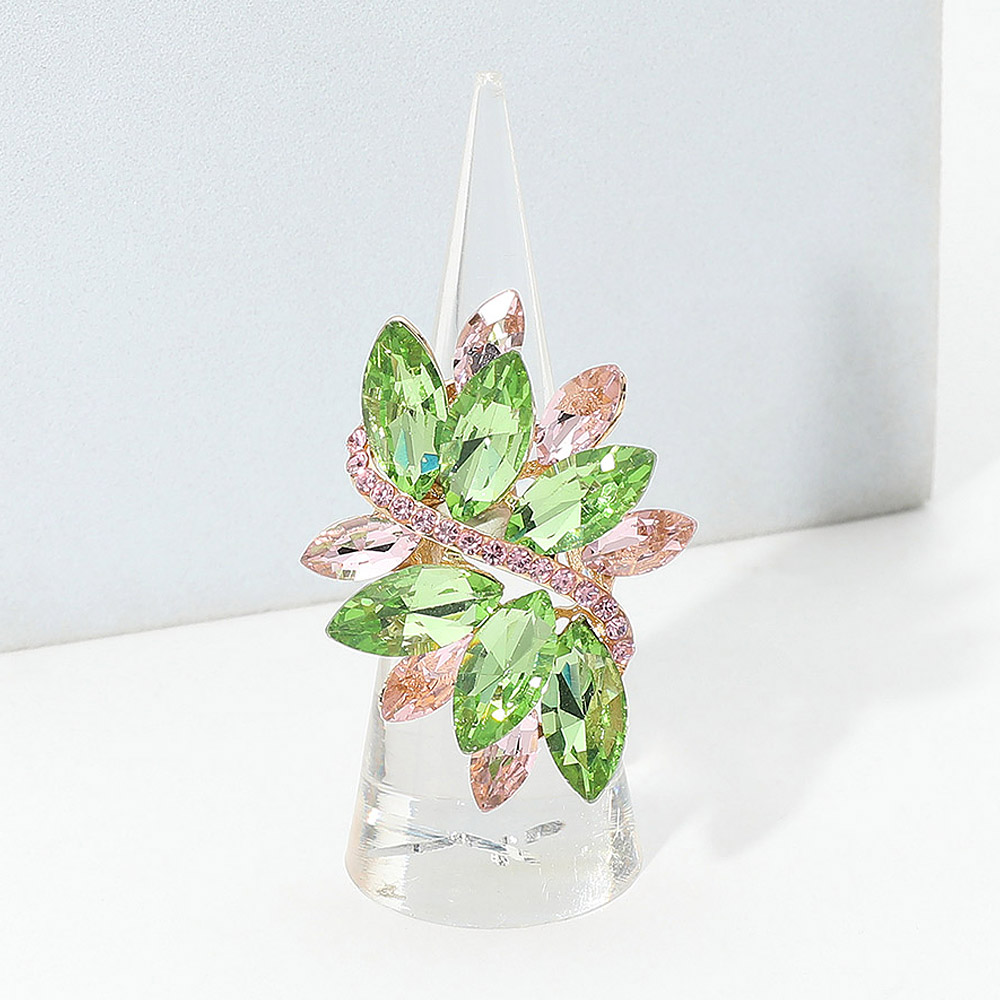 Details • Size : 1" X 1.5" • Stretchable • Shine bright with a statement cocktail ring designed in a striking crystal leaf motif. Featuring multi-faceted stones and dazzling sparkle, this glamorous accessory is perfect for parties, special occasions, or elevating everyday outfits with bold elegance.