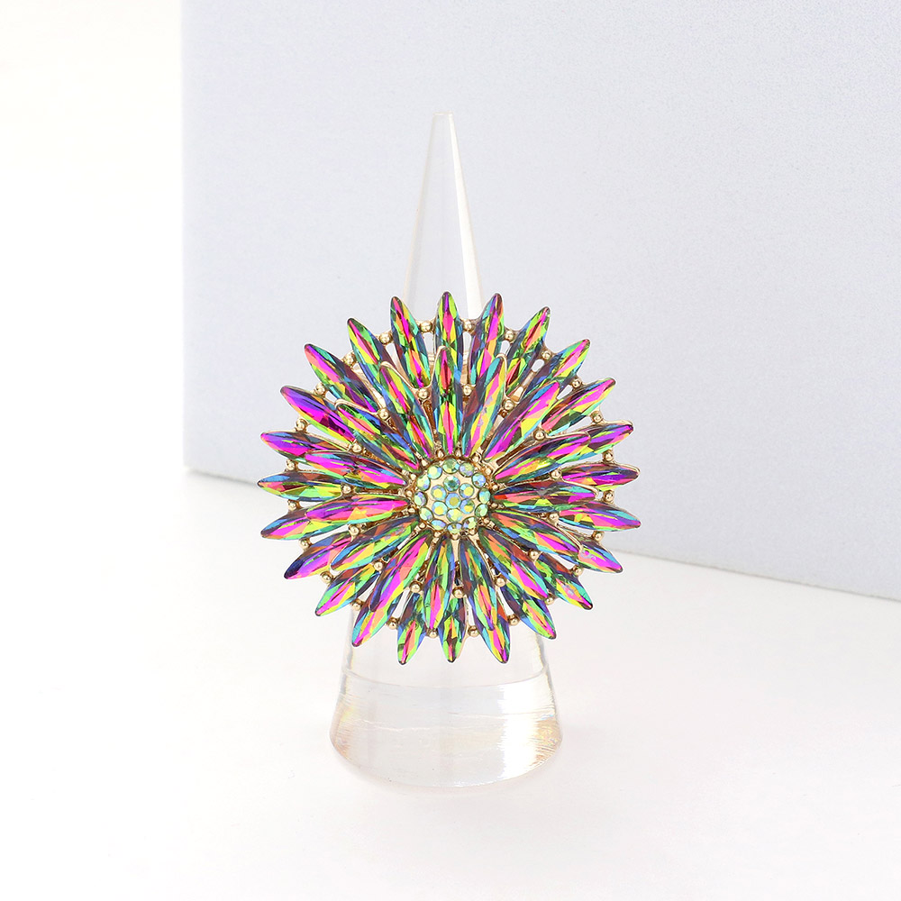 Details • Size : 1.5" H • Stretchable • Shine bright with this floral statement ring featuring layered radiant petals and a sparkling crystal center. Its bold yet elegant design adds a dazzling touch to party outfits, formal wear, or special occasions, making it the perfect accessory to express unique and glamorous style.