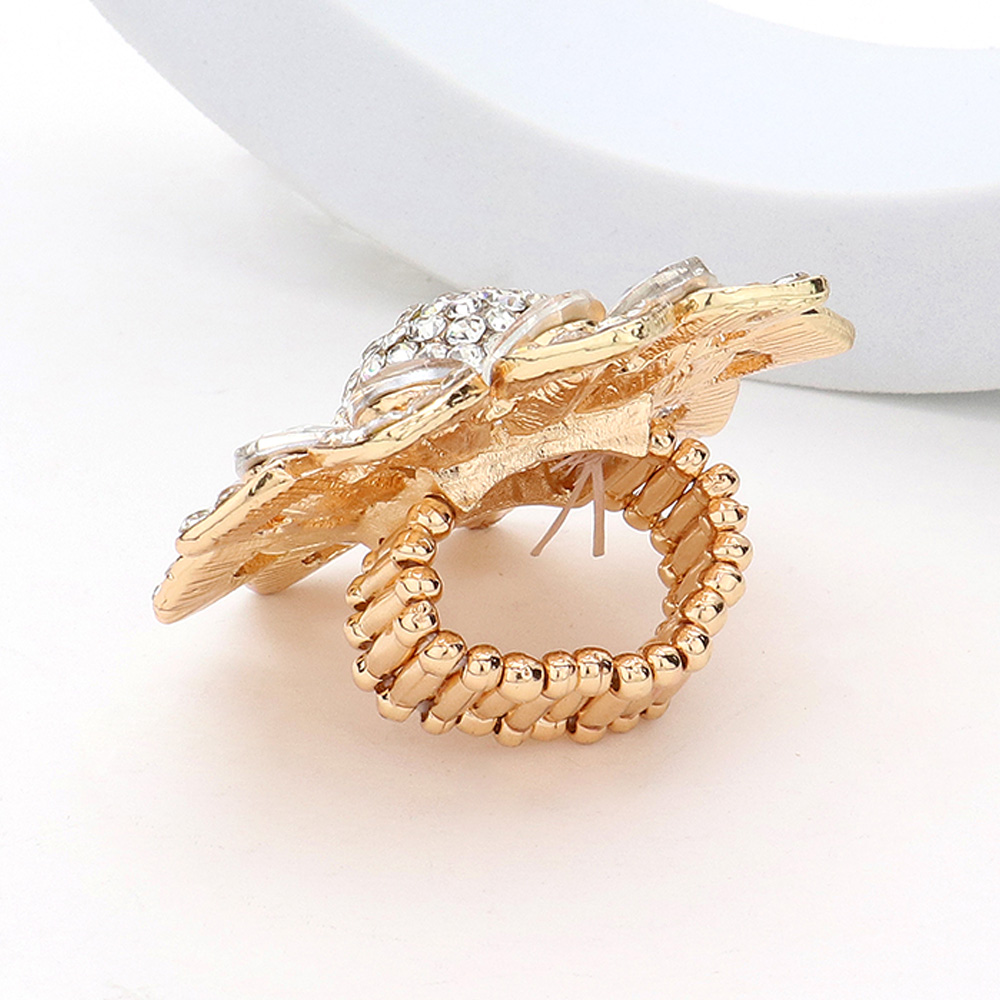 Oval Glass Stone Embellished Rhinestone Paved Flower Stretch Ring