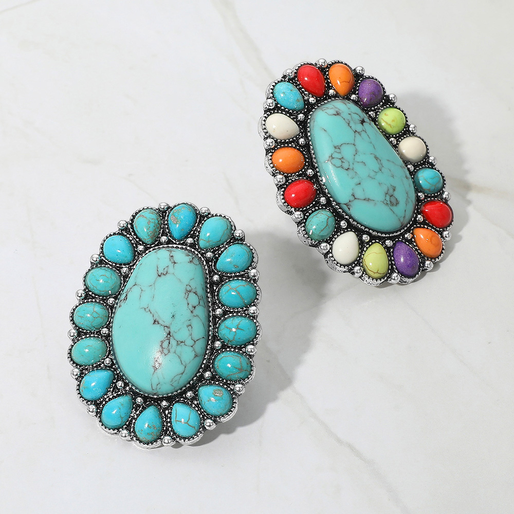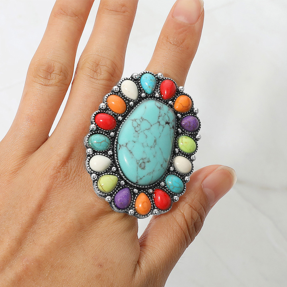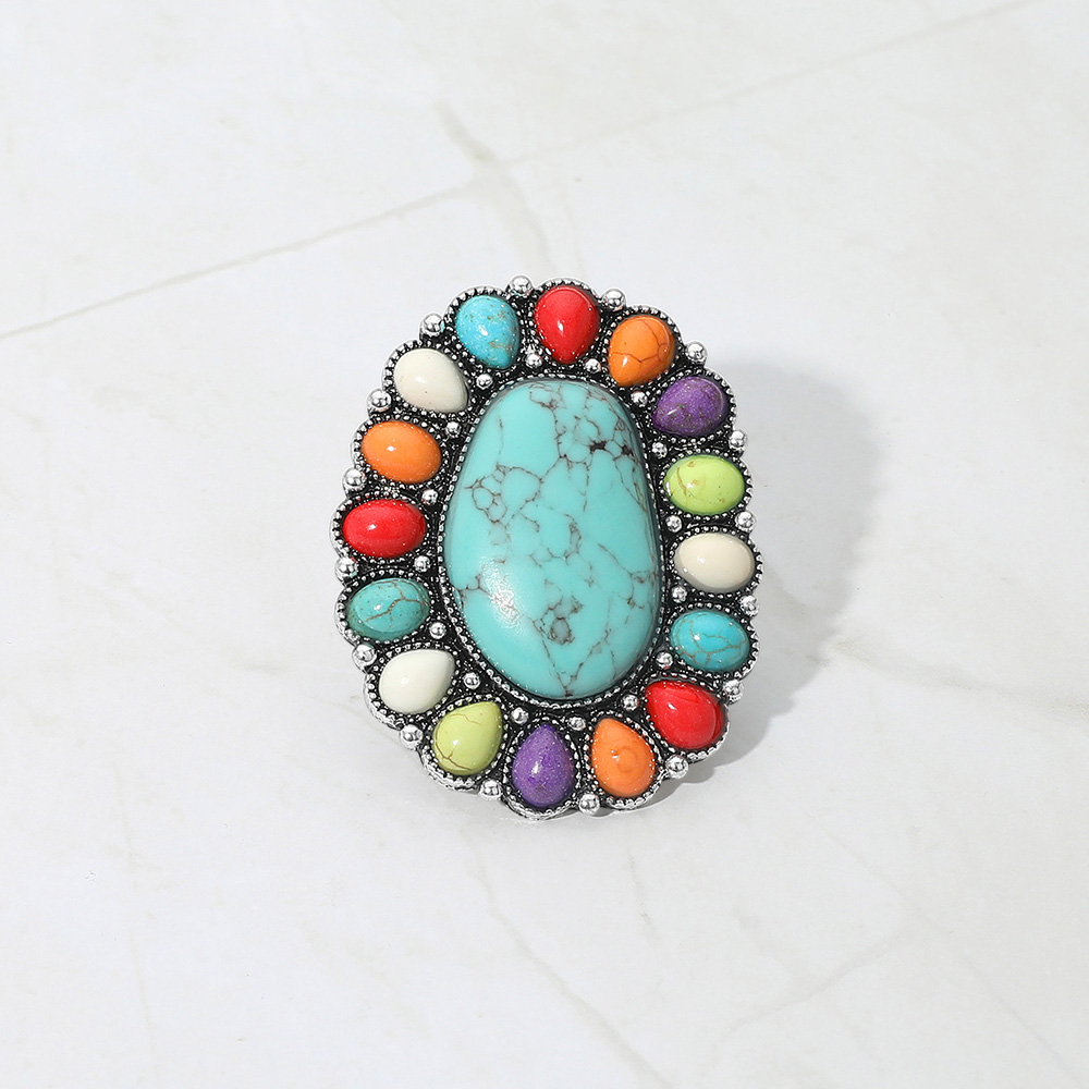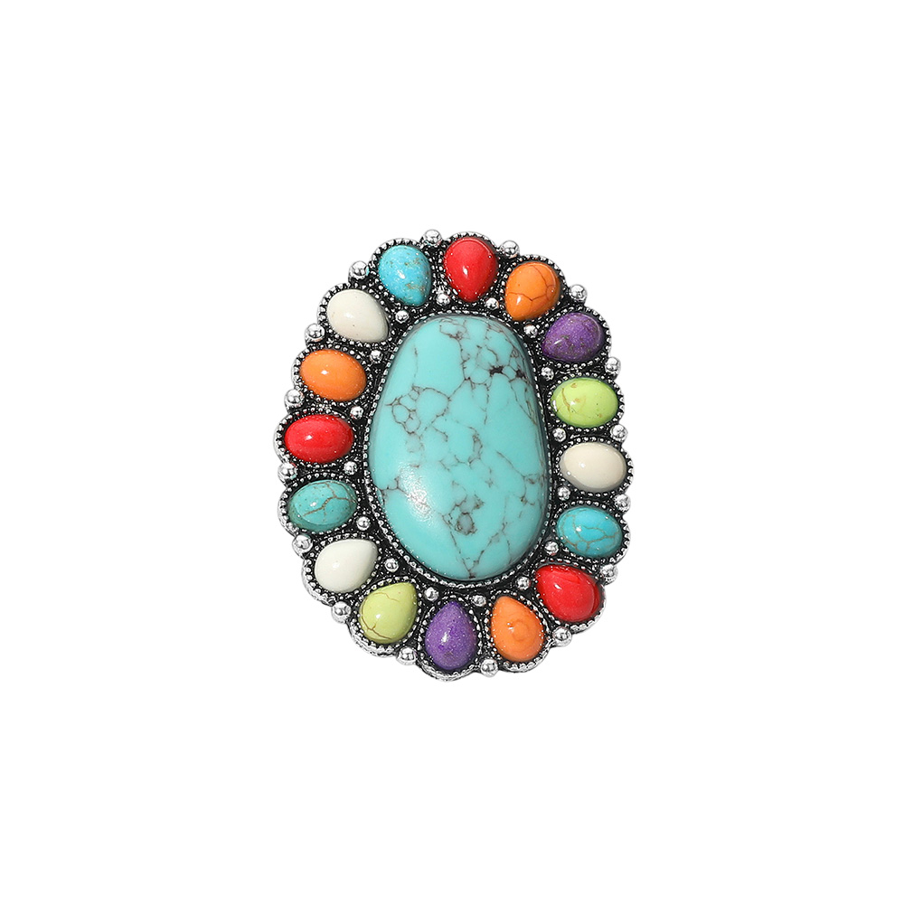 Details • Size : 2.1" H • Stretchable • Make a bold style statement with this eye-catching multicolor gemstone ring. Its vibrant boho-inspired design adds flair to casual and dressy looks. Perfect for festivals, parties, or gifting, this adjustable ring brings unique charm and personality to any outfit. • Lead and Nickel Compliant