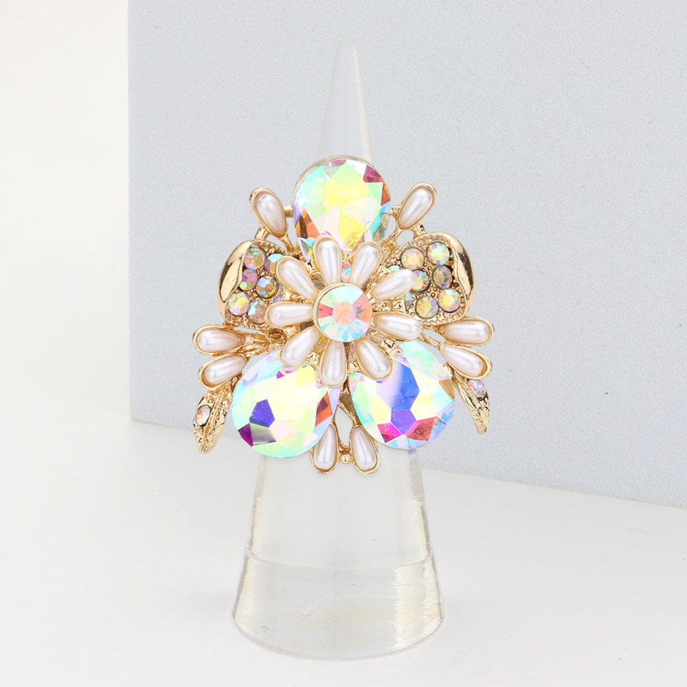 Pearl Embellished Teardrop Stone Accented Flower Stretch Ring