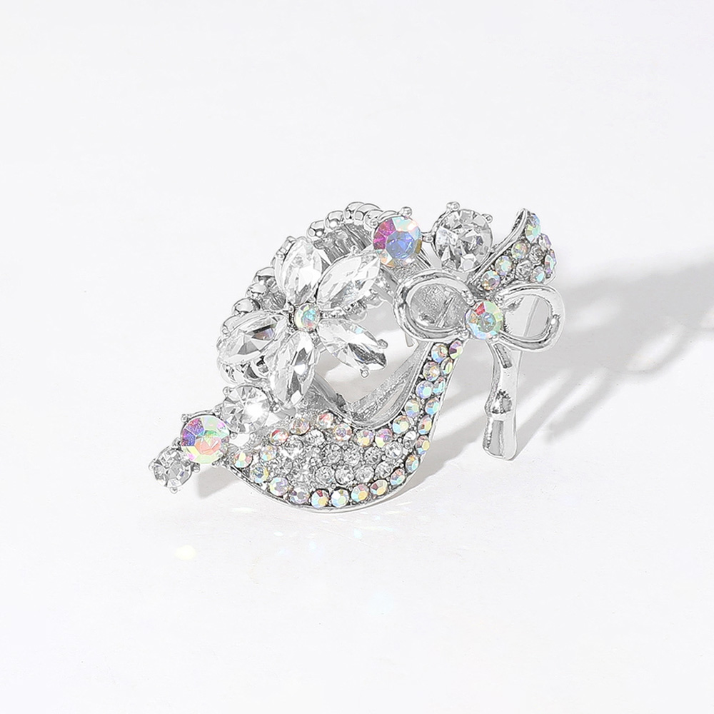 Details • Size : 1.3" H • Stretchable • Add sparkle and charm to your look with this crystal brooch featuring a high heel design adorned with floral details and a dainty bow. Perfect for accessorizing blazers, scarves, or bags, this statement piece elevates any outfit with a touch of glamour and elegance. • Lead and Nickel Compliant
