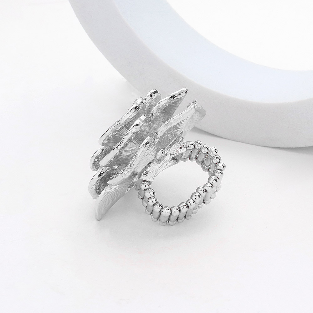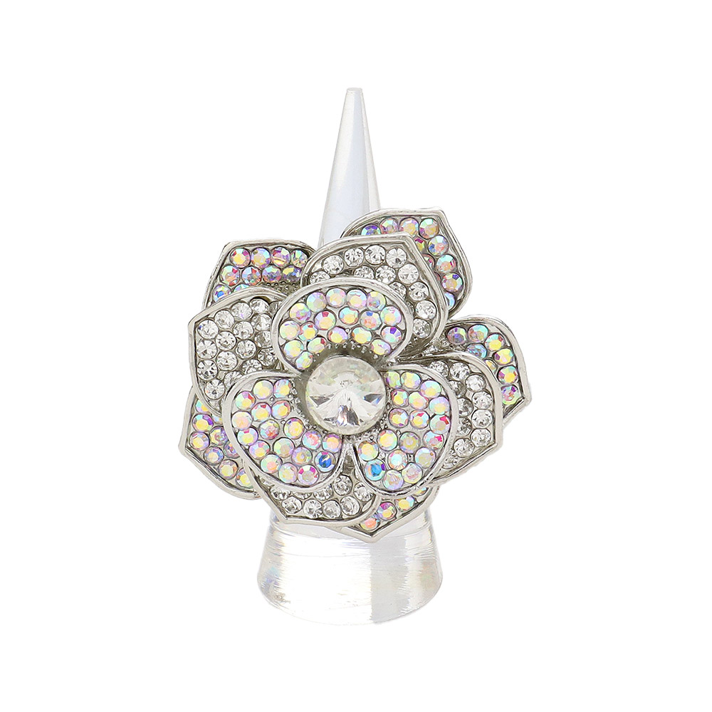 Round Stone Centered Rhinestone Paved Flower Stretch Ring