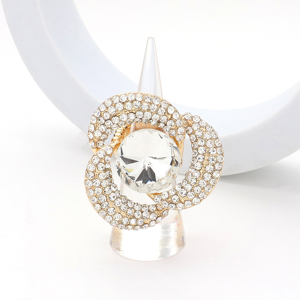 Round Stone Centered Rhinestone Paved Flower Stretch Ring