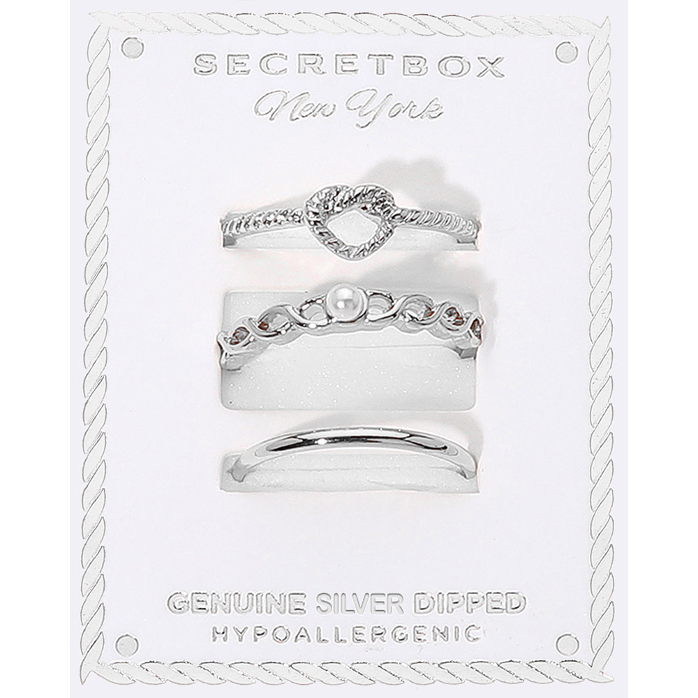 Details • Size : 0.1" - 0.25" H • Size 7 Only • Delicate heart and pearl detail ring set made with genuine silver dipped metal. Hypoallergenic design, perfect for daily wear or special events. Elegant stacking rings with a romantic touch. • Hypoallergenic • Sterling Silver Dipped