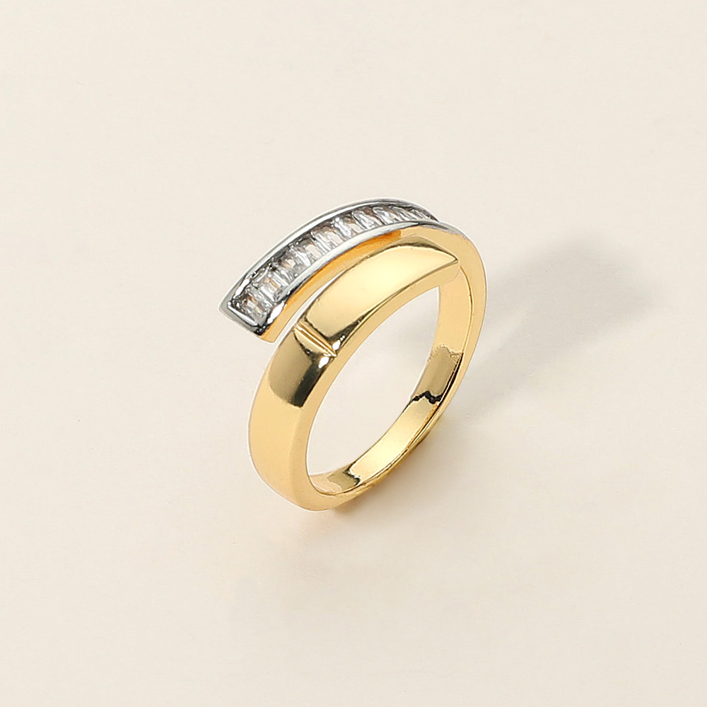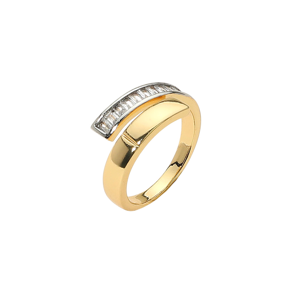 • Elegant gold-tone ring featuring a unique curved band topped with baguette-cut stones for a sleek, contemporary look. Perfect for adding a refined touch to everyday wear or special occasions.