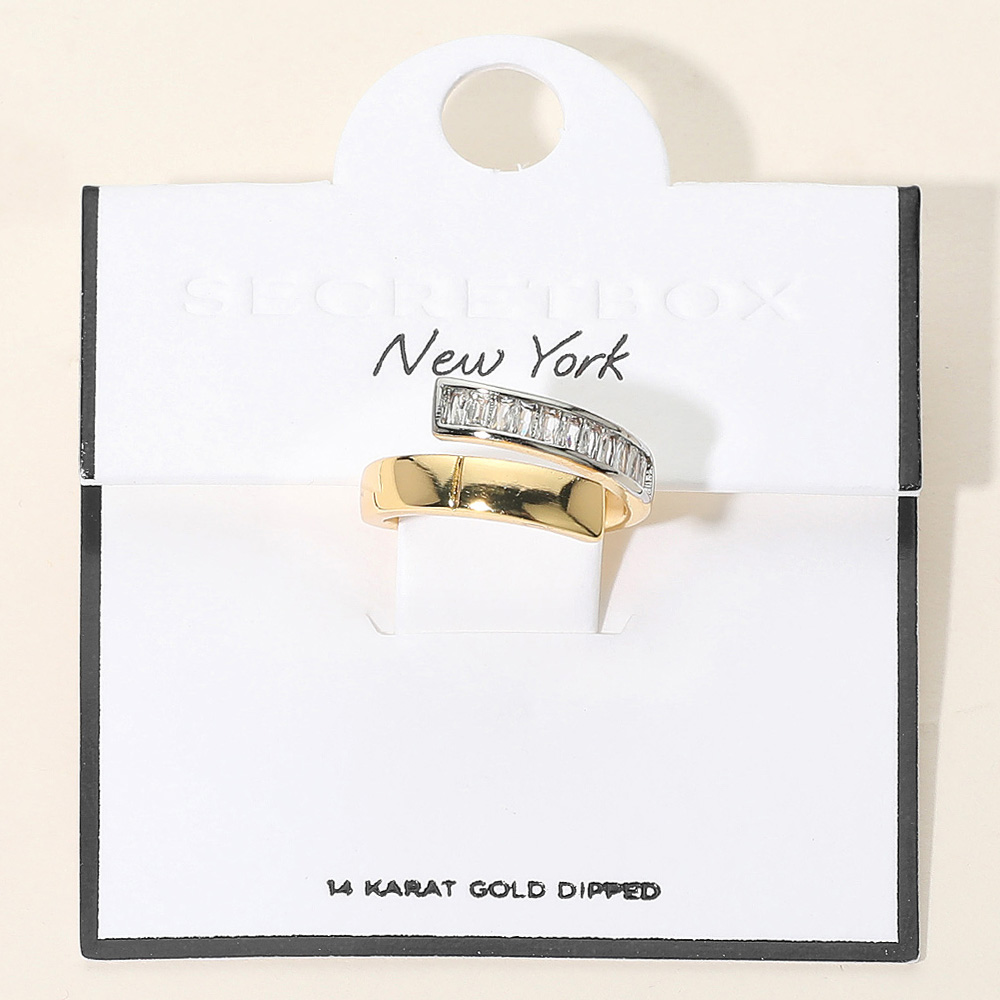 SECRET BOX_14K Gold Dipped Baguette Stone Accent Curved Adjustable Ring
