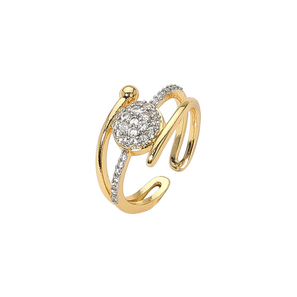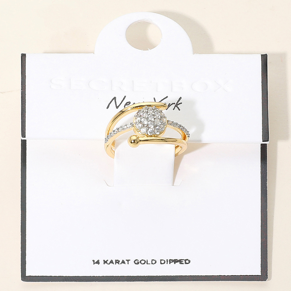 Details • Size : 0.5" H • Adjustable • Unique gold-tone adjustable ring featuring a sparkling pave crystal sphere embraced by an elegant swirl band. A statement accessory that blends modern artistry with timeless glamour for any jewelry collection. • Gold Dipped