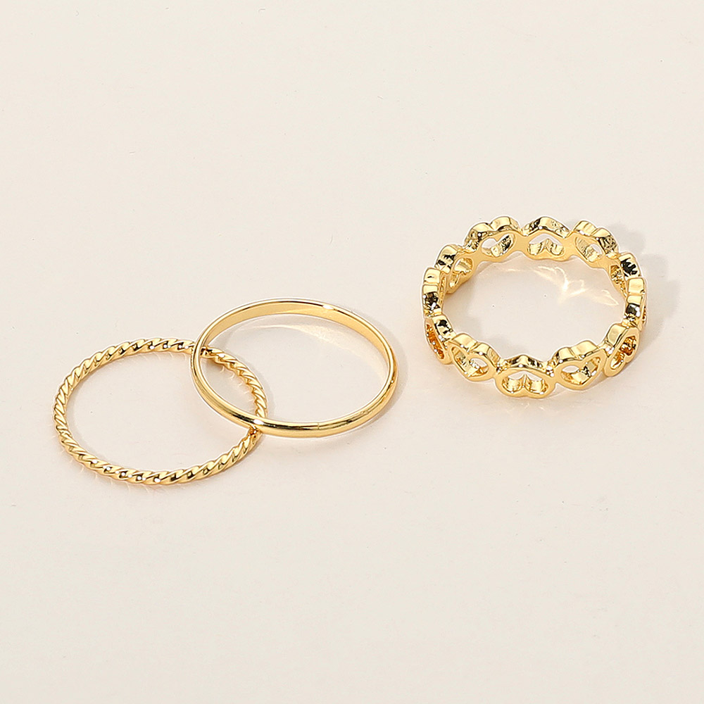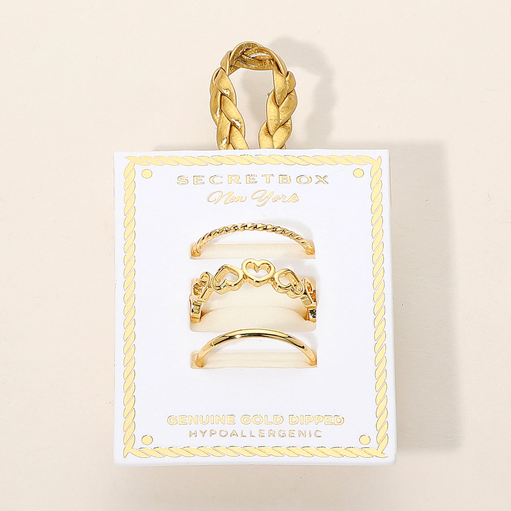 Details • Size : 0.1" - 0.2" H • Size 7 Only • Charming three-piece ring set featuring heart motifs and sleek bands. A playful blend of romance and simplicity, ideal for stacking or gifting with love. • Gold Dipped • Hypoallergenic