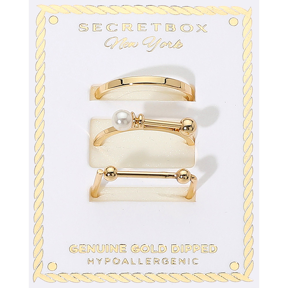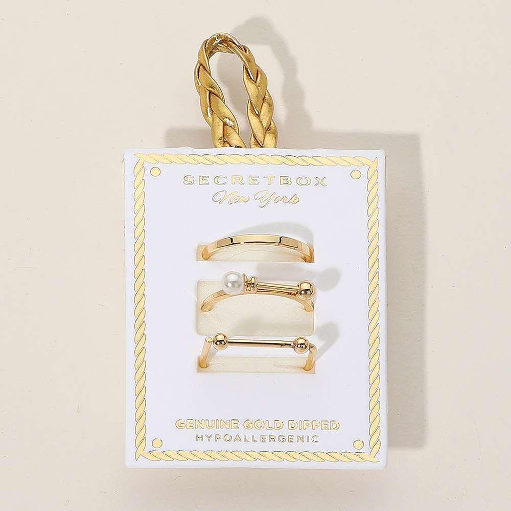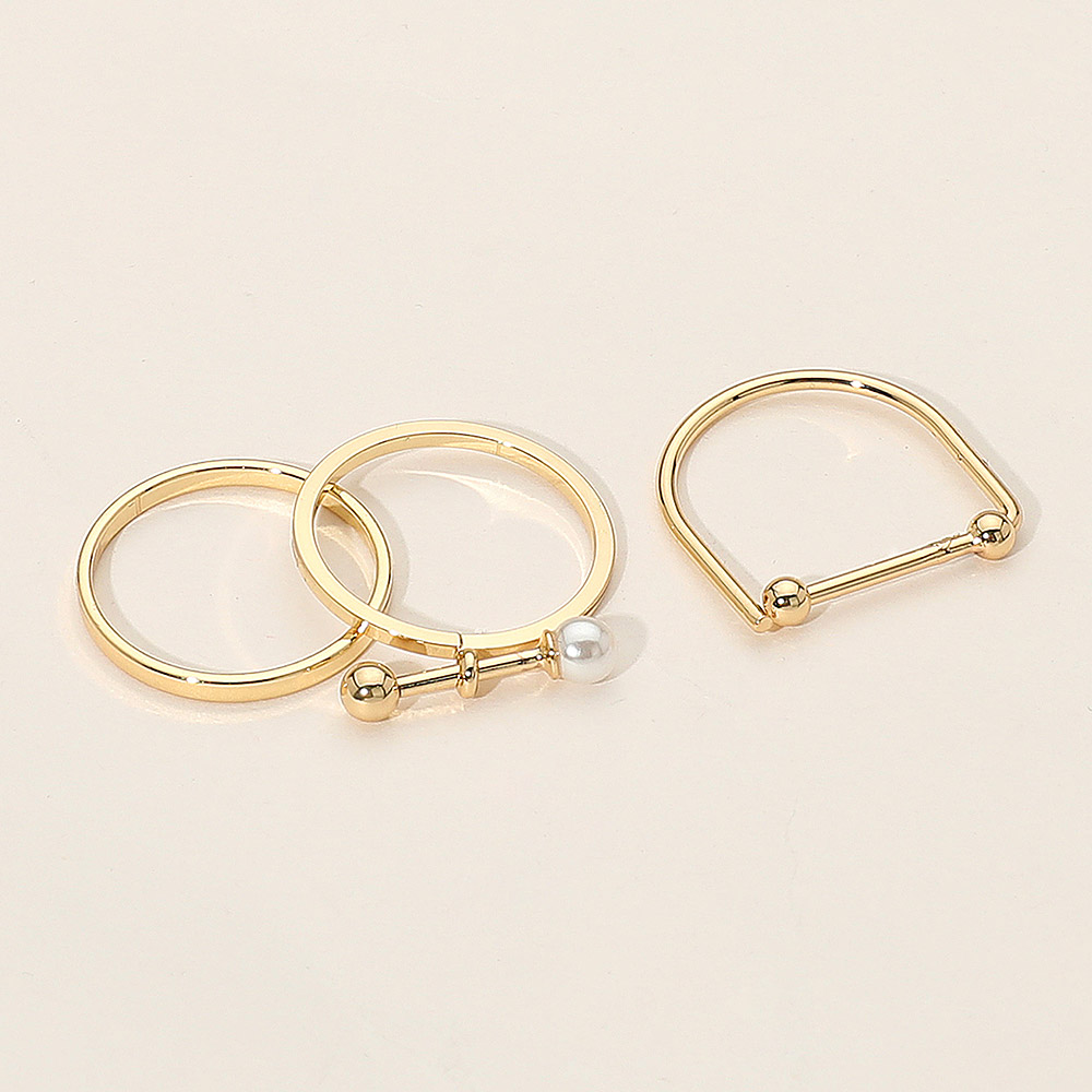 Details • Size : 0.1" - 0.2" H • Size 6.5 Only • Modern 3-piece gold ring set featuring minimalist design and pearl detail. Hypoallergenic and genuine gold dipped, perfect for stacking or solo wear with a sleek contemporary look. • Gold Dipped • Hypoallergenic