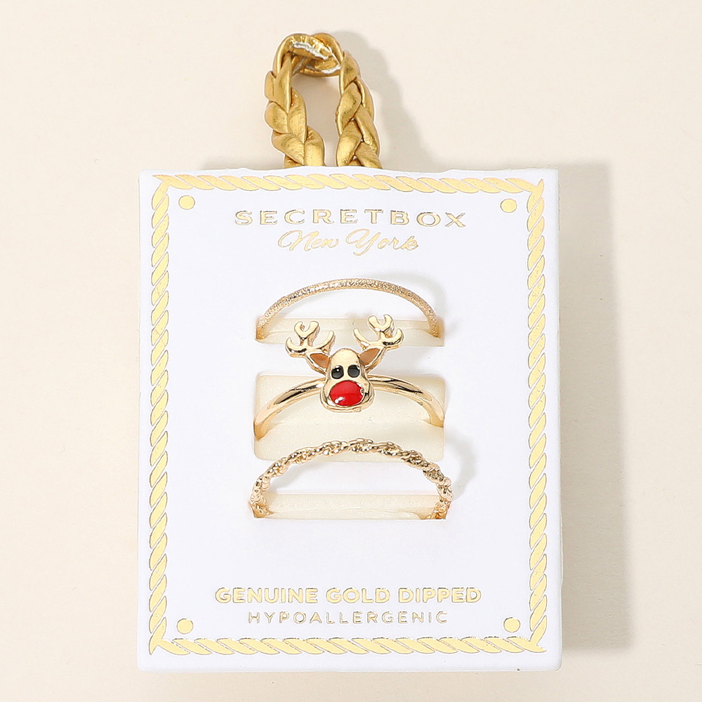 Details • Size : 0.1" - 0.4" H • Playful 3-piece gold-tone ring set featuring a festive reindeer centerpiece with a bright red nose, complemented by two sleek accent bands. A charming accessory for adding holiday cheer to any outfit. • Gold Dipped • Hypoallergenic