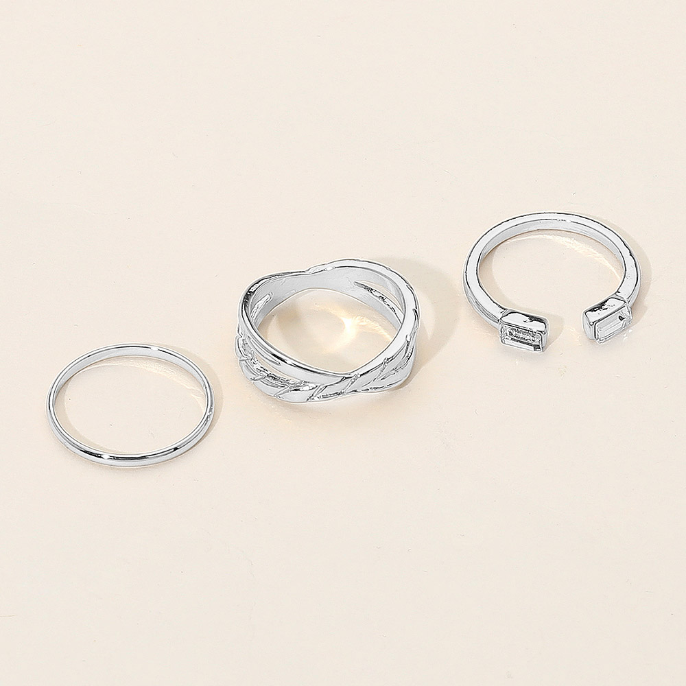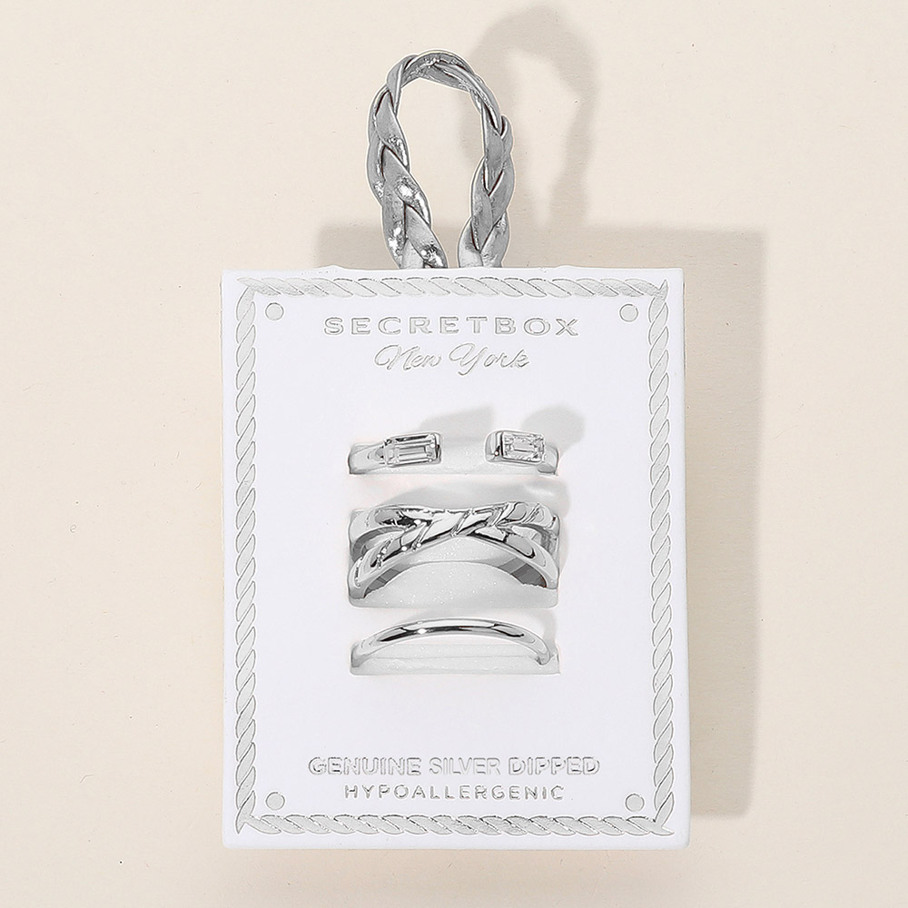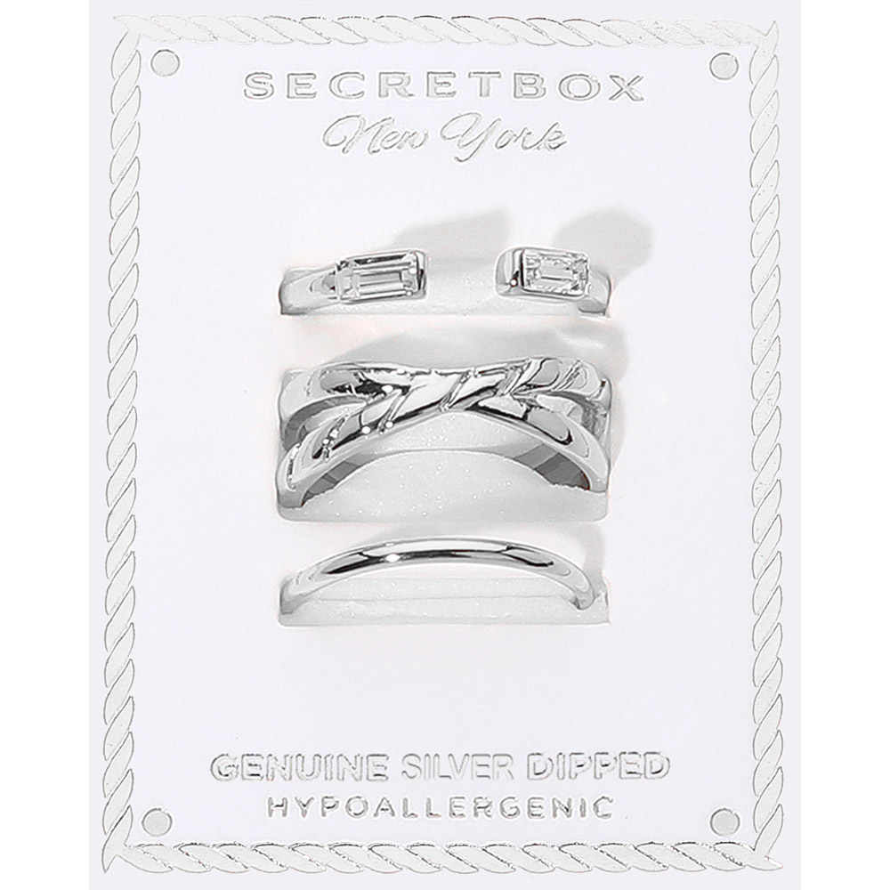 Details • Size : 0.1" - 0.25" H • Size 7 Only • Stylish 3-piece ring set with baguette open ring, engraved leaf detail, and sleek band. Genuine silver dipped and hypoallergenic. A chic mix for everyday or special occasions. • Hypoallergenic • Sterling Silver Dipped