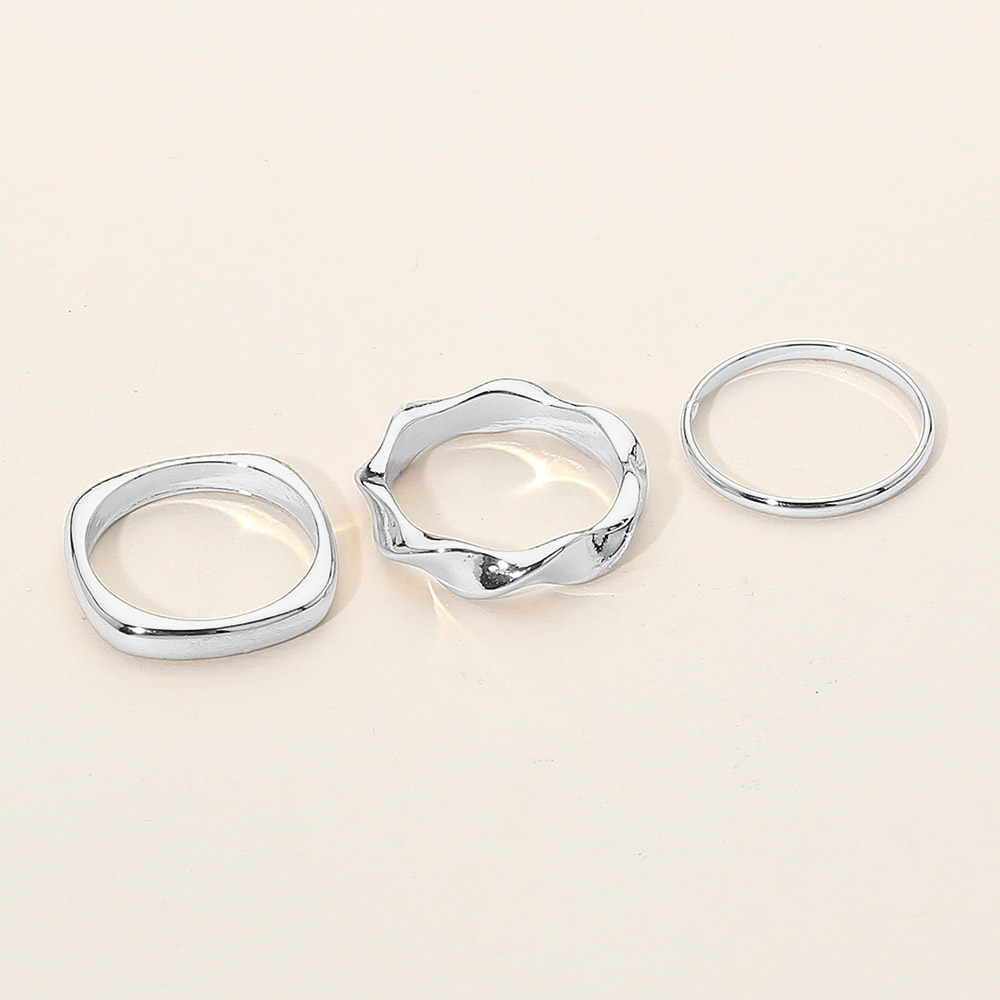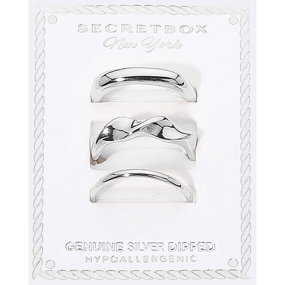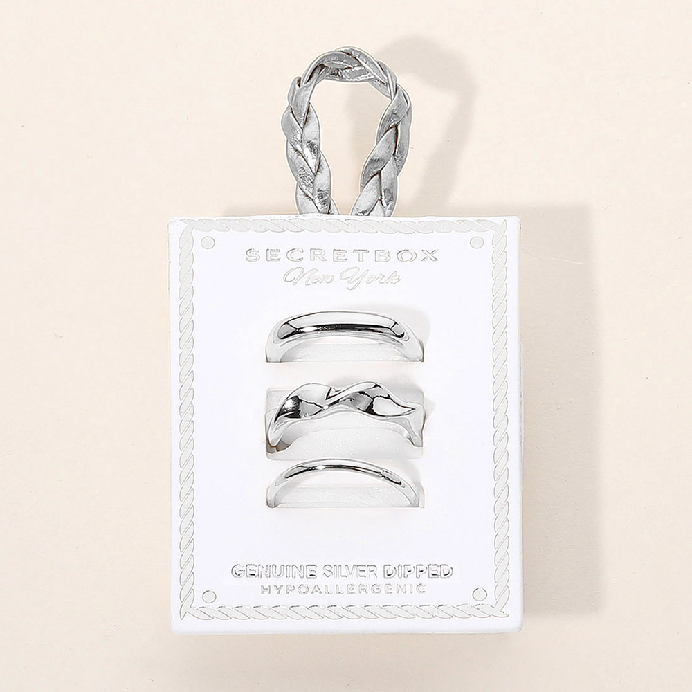 Details • Size : 0.1" - 0.2" H • Size 7 Only • Elegant three-piece ring set featuring smooth, sculptural, and curved designs for a refined, contemporary look. Perfect for stacking or wearing solo to elevate your everyday style. • Hypoallergenic • Sterling Silver Dipped