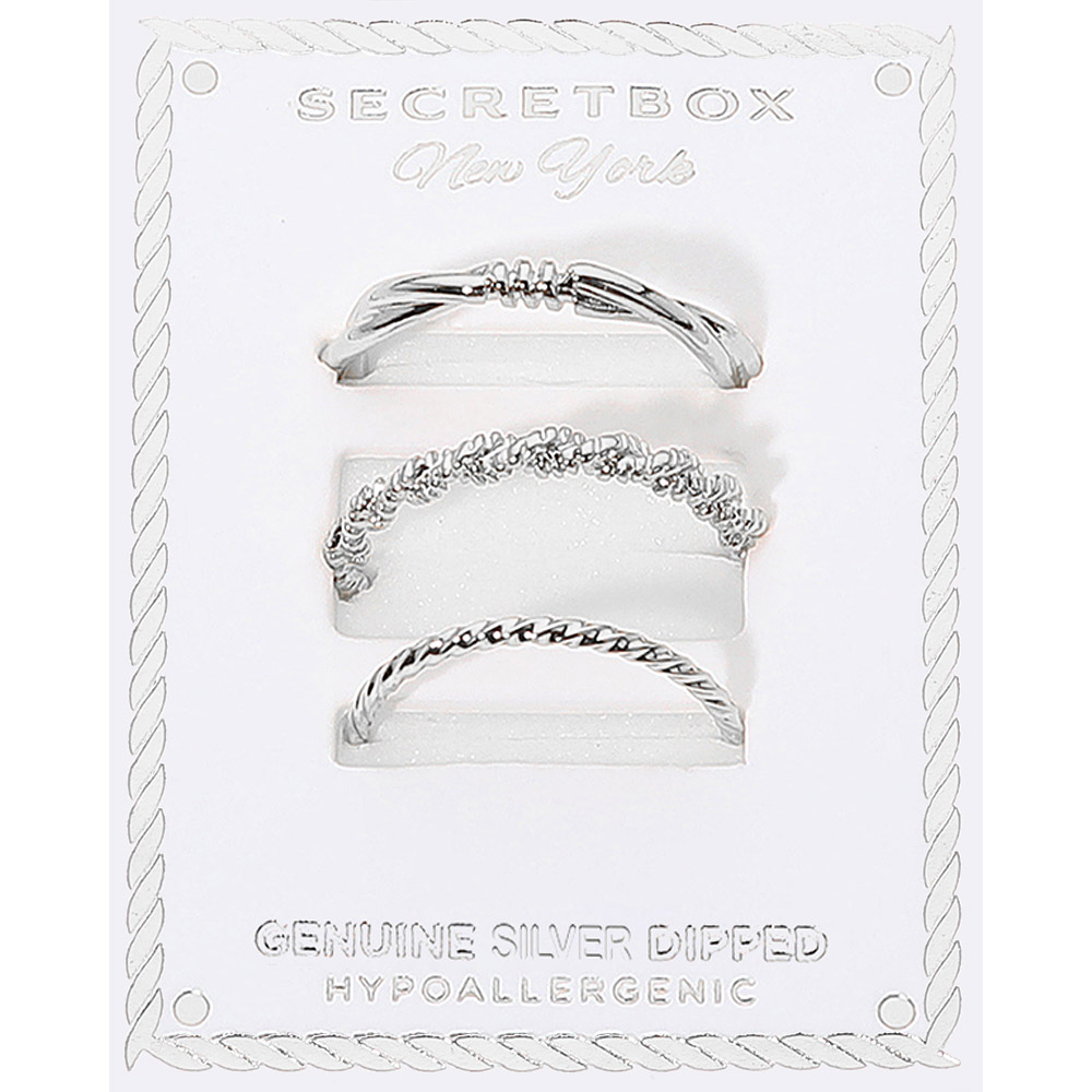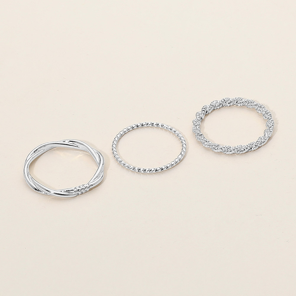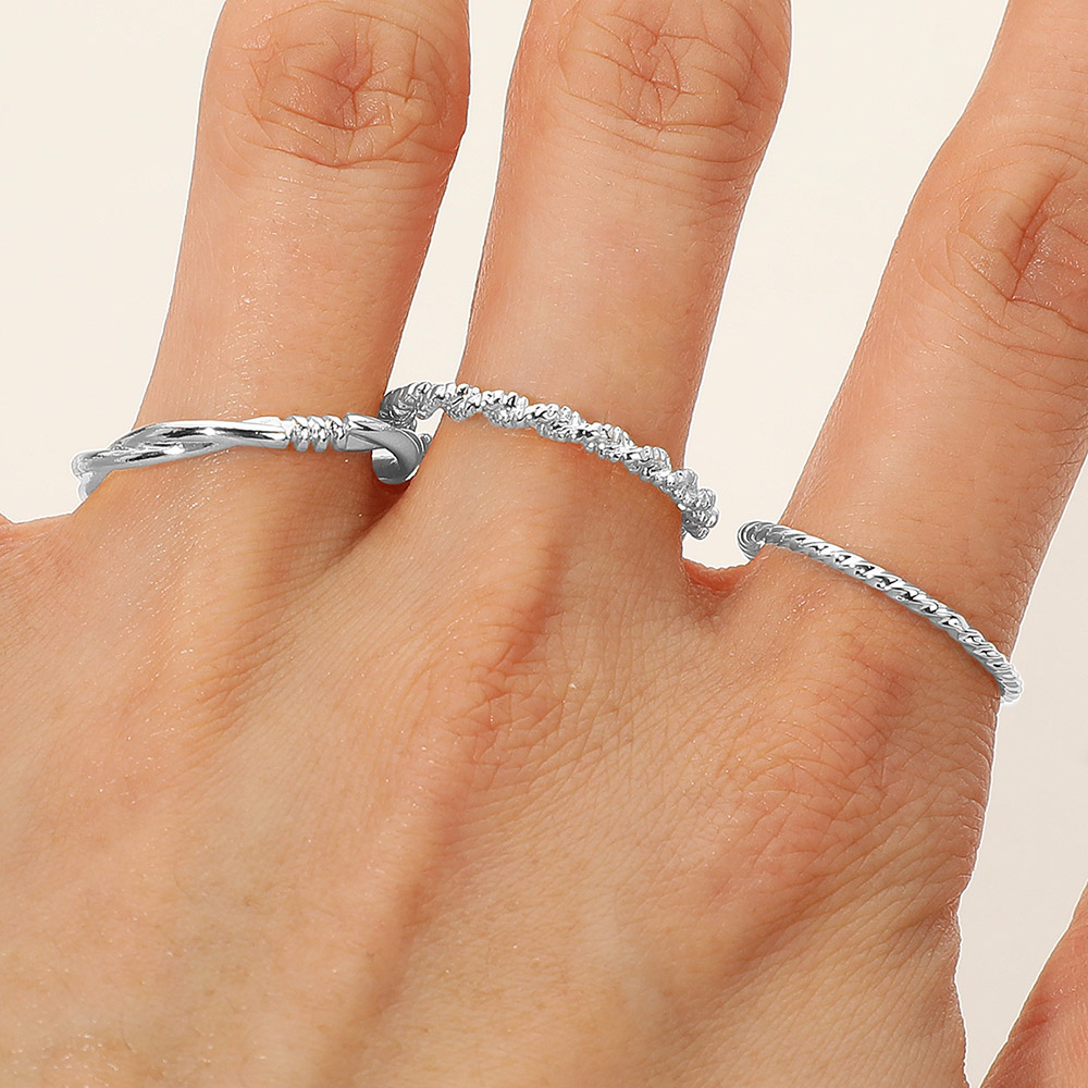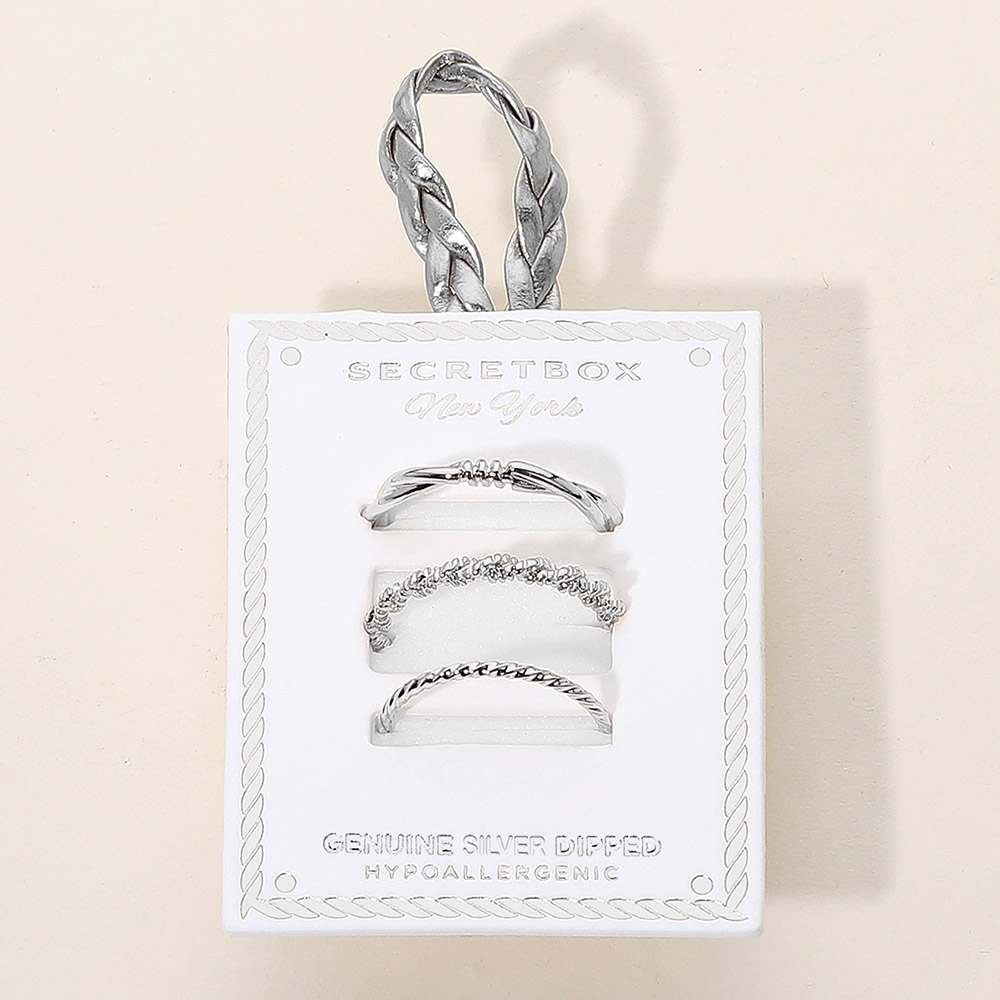 Details • Size : 0.1" H • Size 7 Only • Stylish set of three stackable rings with unique textures and refined shapes, ideal for layering or wearing individually to complement everyday and occasion looks. • Hypoallergenic • Sterling Silver Dipped