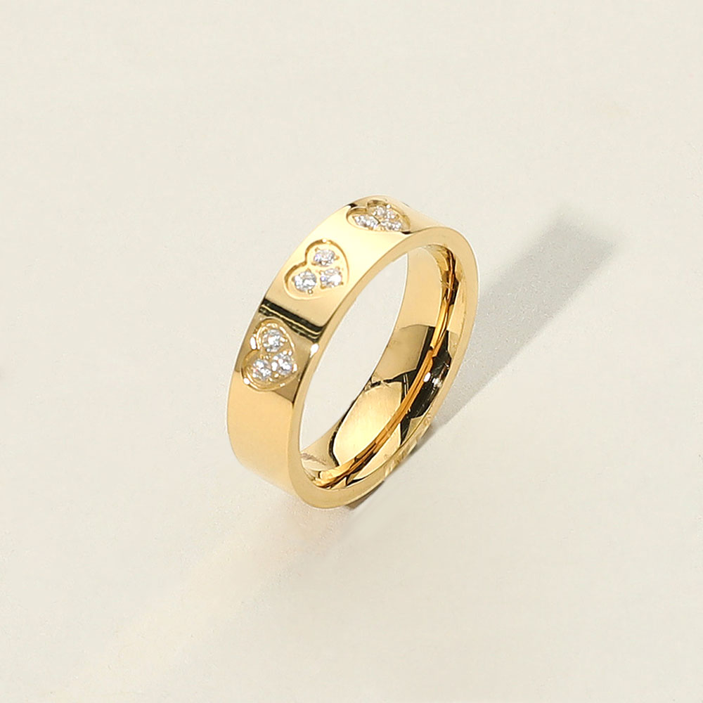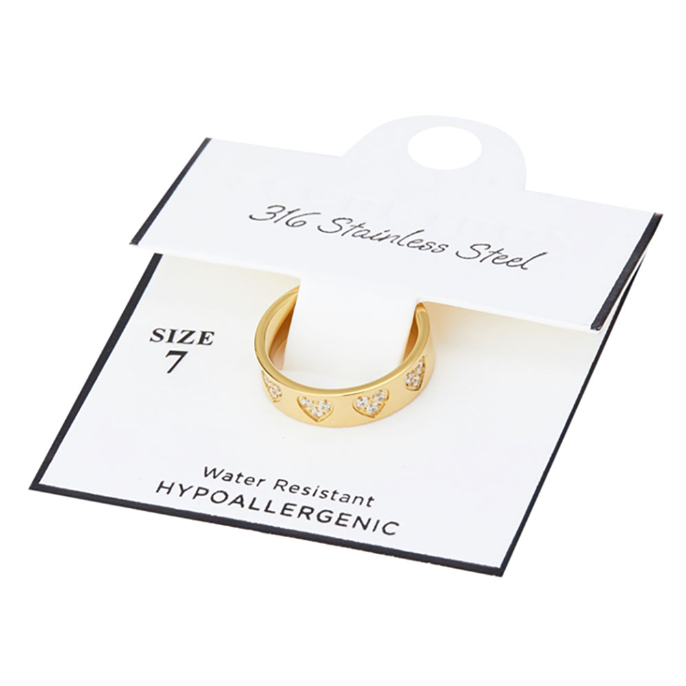 Details • Size : 0.25" H • Size 7 Only • Water Resistant • Chic band ring featuring delicate heart-shaped accents and embedded gemstones for a subtle yet stylish sparkle. Ideal for everyday elegance or as a meaningful gift that blends charm and simplicity with a modern edge. • Hypoallergenic • Stainless Steel