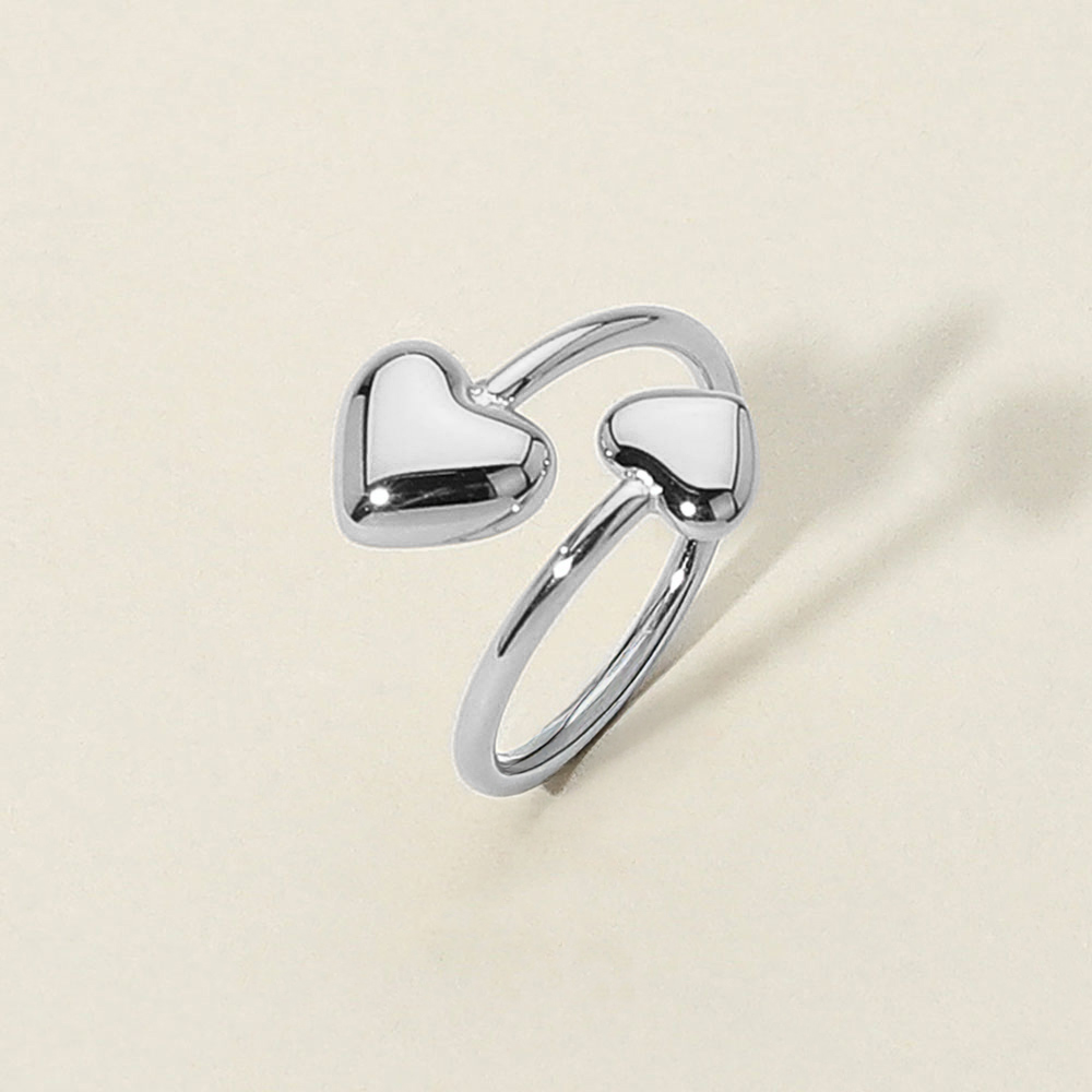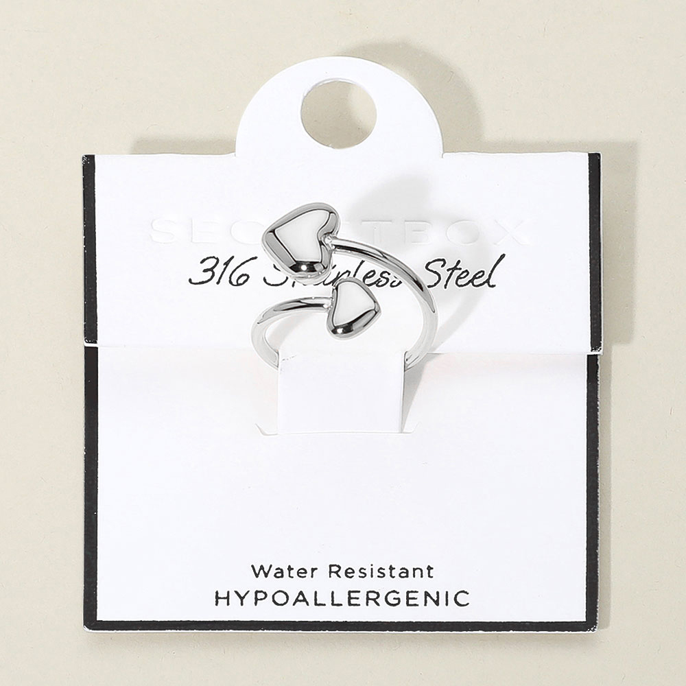 Details • Size : 0.75" H • Adjustable • Water Resistant • Chic adjustable gold heart ring crafted from stainless steel. Features a dual heart design with a polished finish—perfect for daily wear or gifting. Fits most sizes comfortably with its open band style. • Hypoallergenic • Stainless Steel