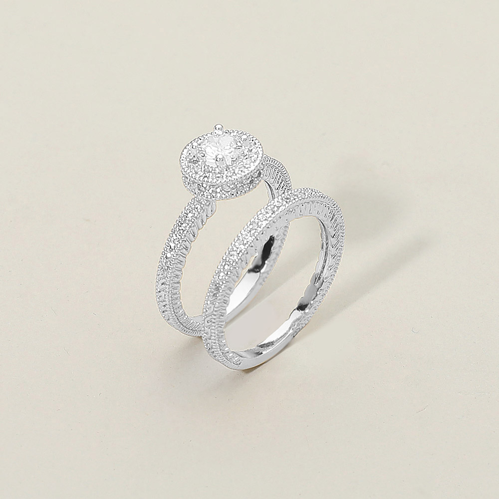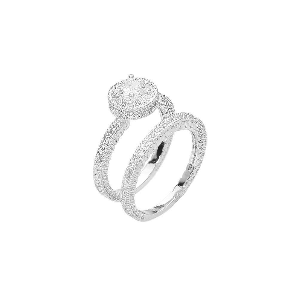 • Stylish two piece ring set featuring an oval halo cubic zirconia centerpiece complemented by a matching pave band. The elegant design radiates sophistication, perfect for engagements, weddings, or elevating everyday looks with a touch of timeless sparkle.