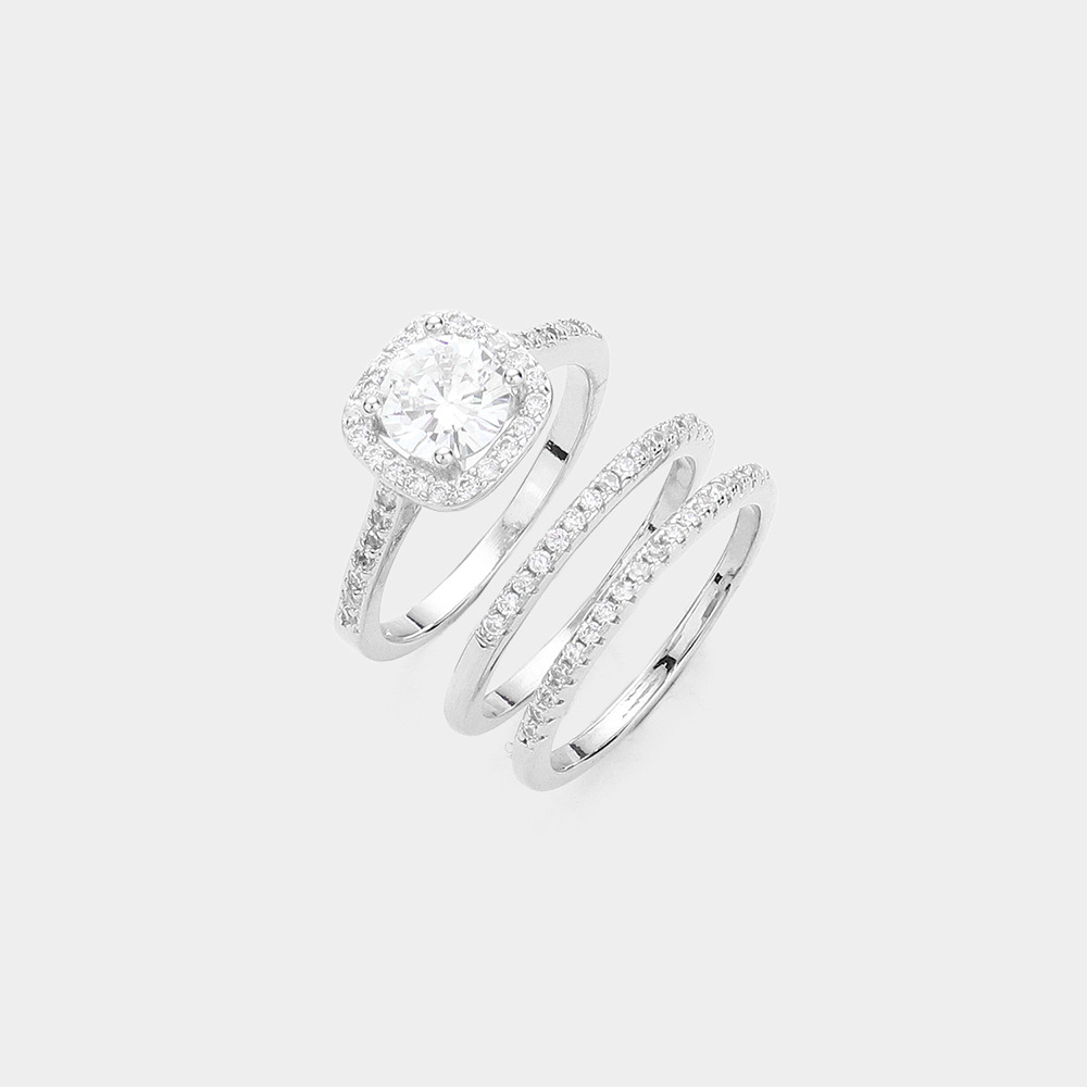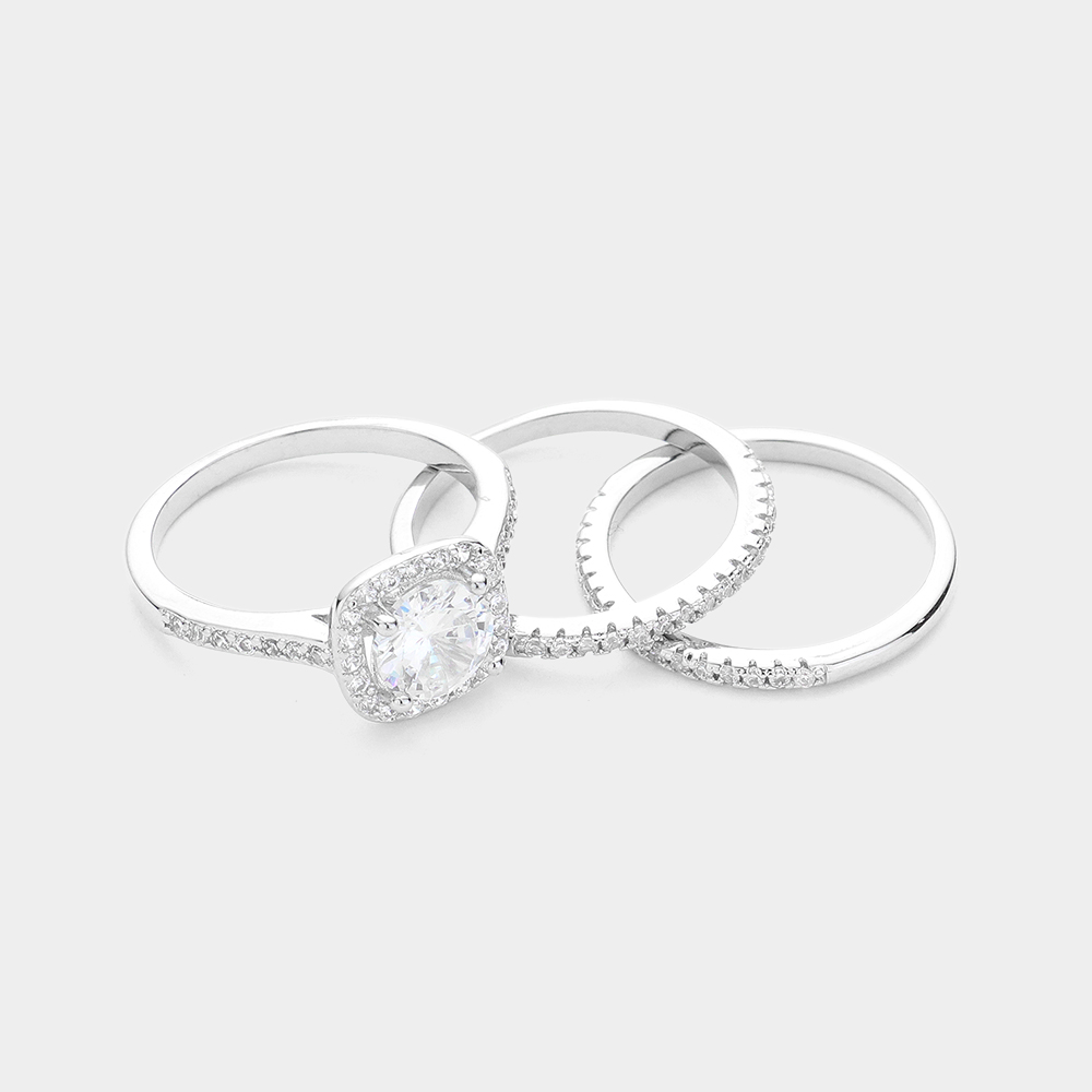 3PCS - Round Stone Accented Halo Ring and Wedding Bands