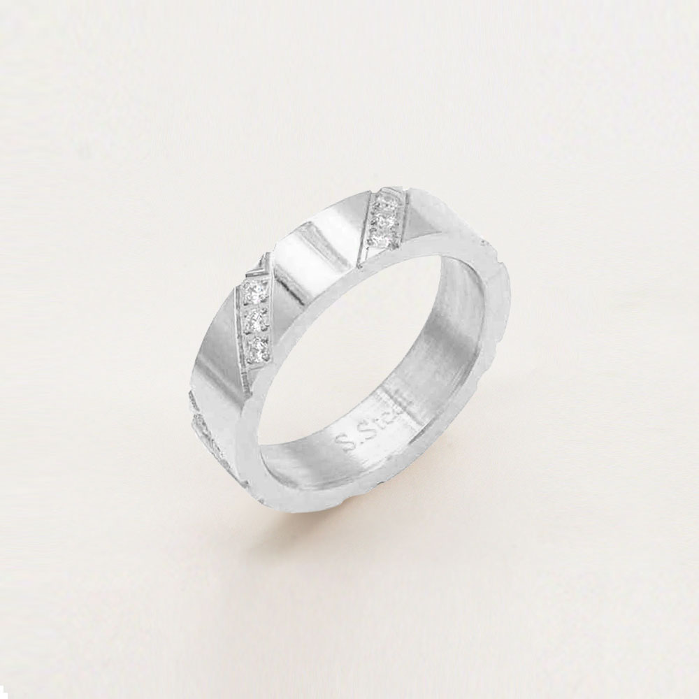 • Stainless steel CZ band ring with modern cutout design. Tarnish-resistant, perfect for stacking or daily wear. Great unisex gift.