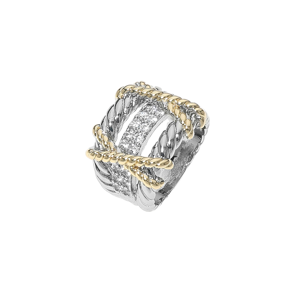 Details • Size : 0.75" H • Chic two-tone ring with a bold X design, textured metalwork, and sparkling CZ center band. A statement piece that blends modern edge with classic shine. • CZ Cubic Zirconia