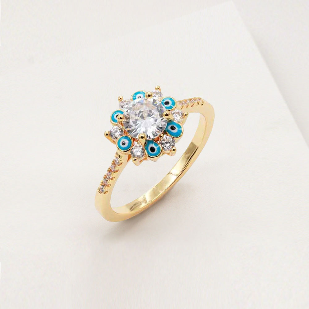 Details • Size : 0.4" H (Size 6,7,8,9) • Elegant halo ring featuring a brilliant CZ center surrounded by delicate evil eye accents. A unique design that blends sparkle with protective symbolism for a distinctive everyday look. • Lead and Nickel Compliant • CZ Cubic Zirconia