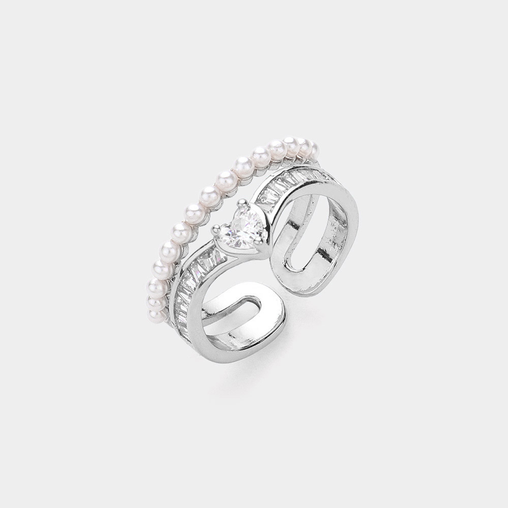 Heart Stone Pointed Pearl Paved Layered Ring