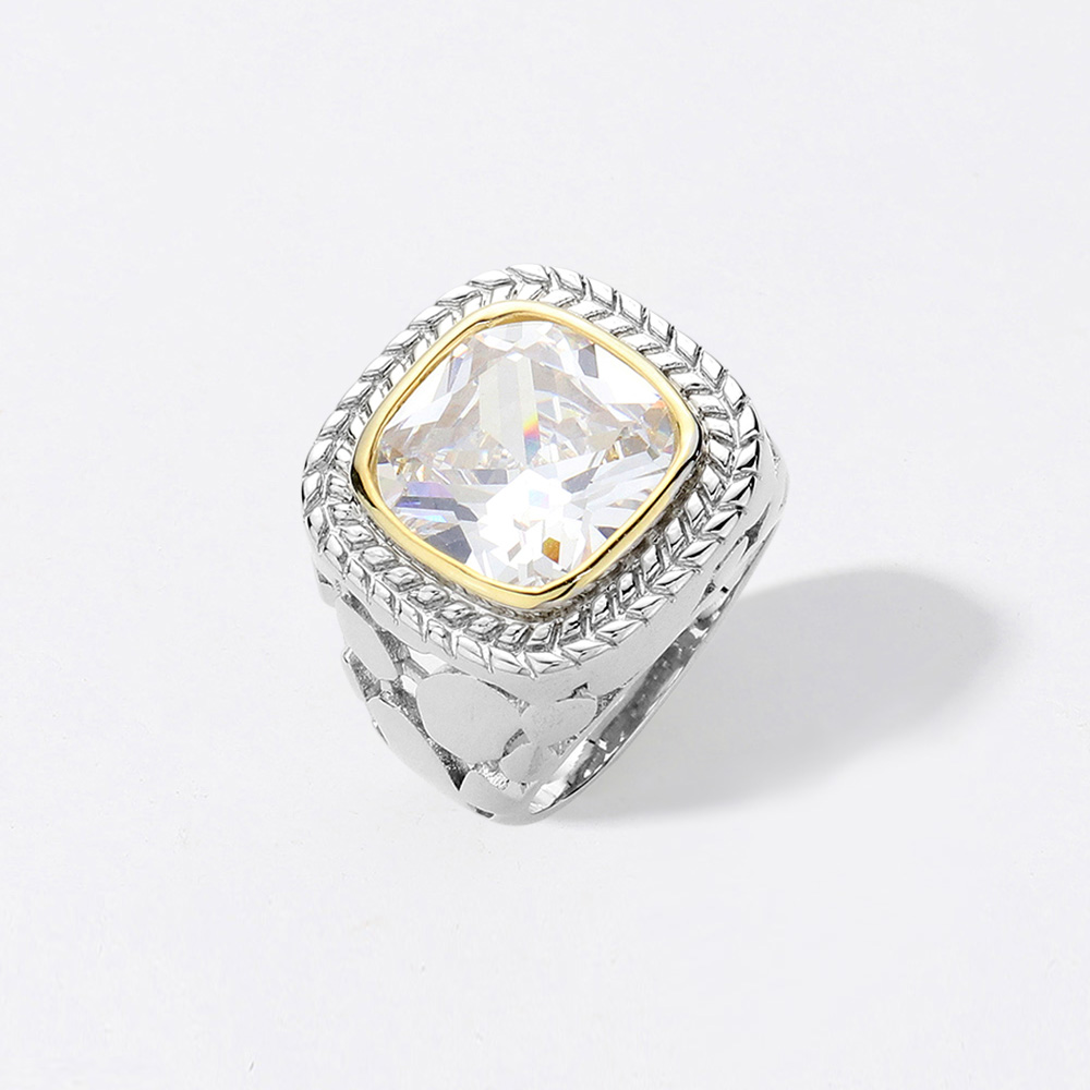 Details • Size : 0.75" H • Bold ring featuring a large cushion-cut centerpiece framed by a textured border and intricate band design. A striking accessory that adds sophistication and sparkle to any outfit. Perfect for formal occasions or making a powerful everyday style statement. • CZ Cubic Zirconia