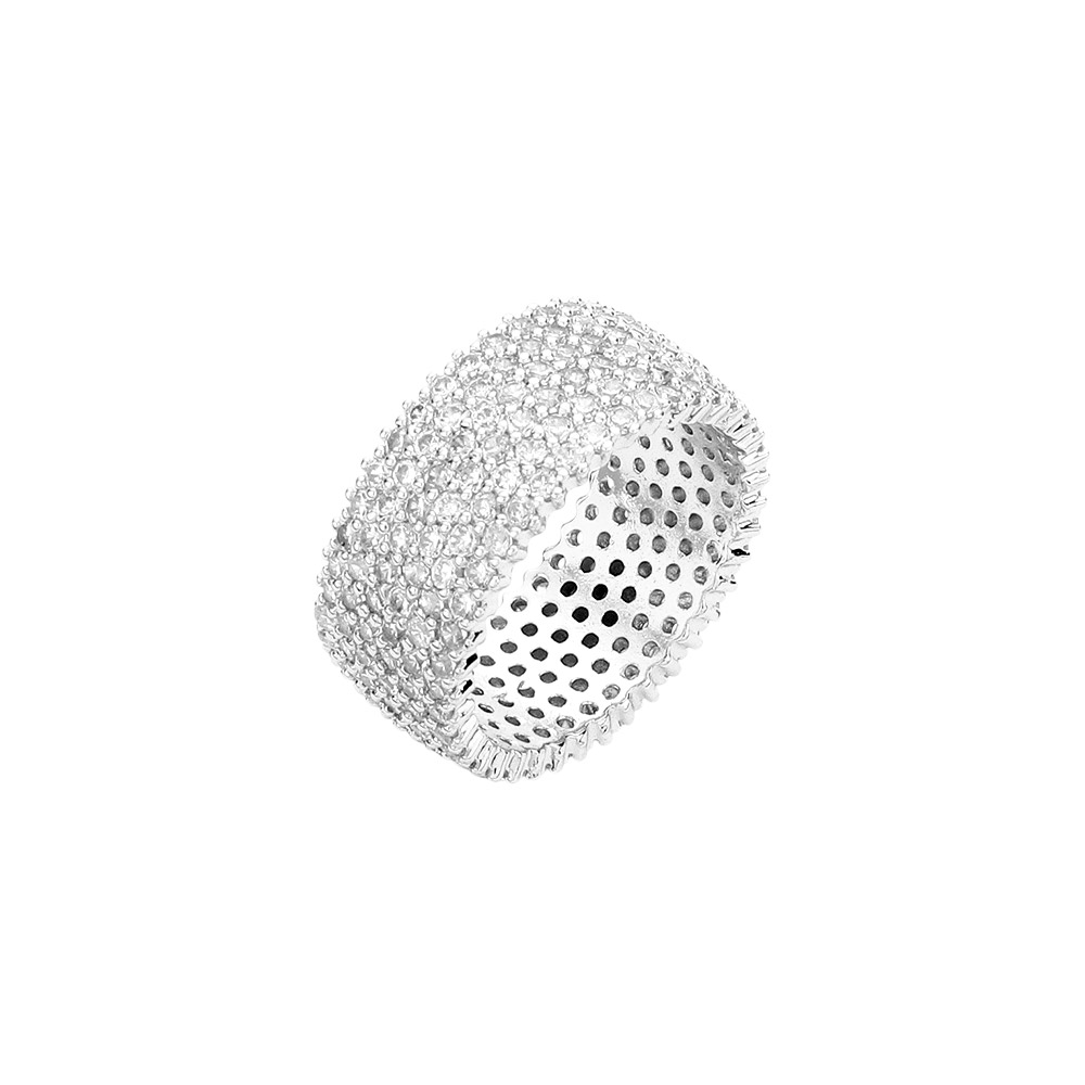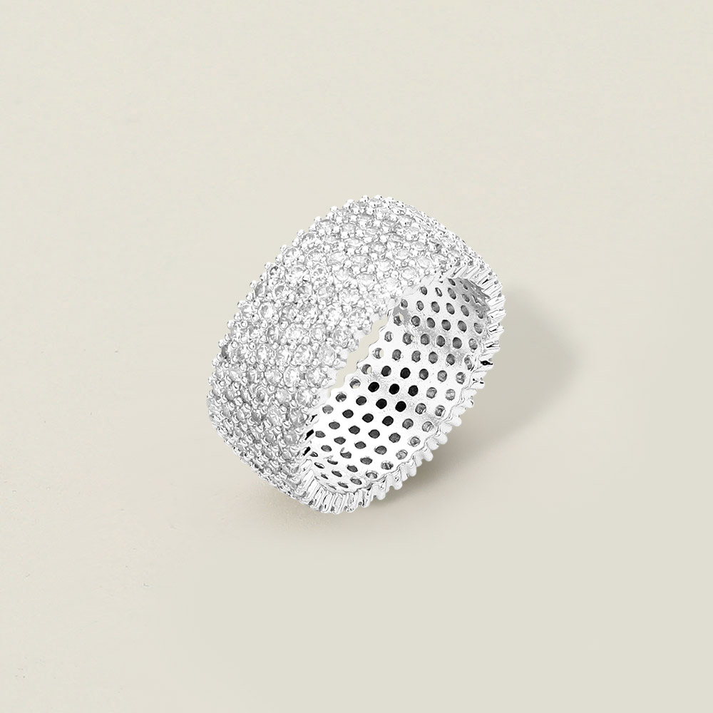 • Elegant wide band ring featuring a full pave surface that delivers maximum sparkle and a bold statement look. Designed with a smooth interior for comfortable wear, this shimmering piece adds refined brilliance to any style and makes a standout accessory for everyday or special occasions.