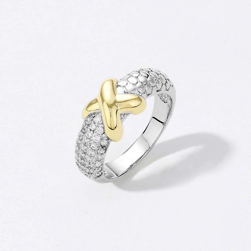 Details • Size : 0.3" H • Elevate your jewelry collection with this two-tone crossover ring featuring shimmering accents and a bold centerpiece design. A versatile statement piece perfect for daily wear, special occasions, or gifting to someone who loves elegant modern jewelry. • CZ Cubic Zirconia