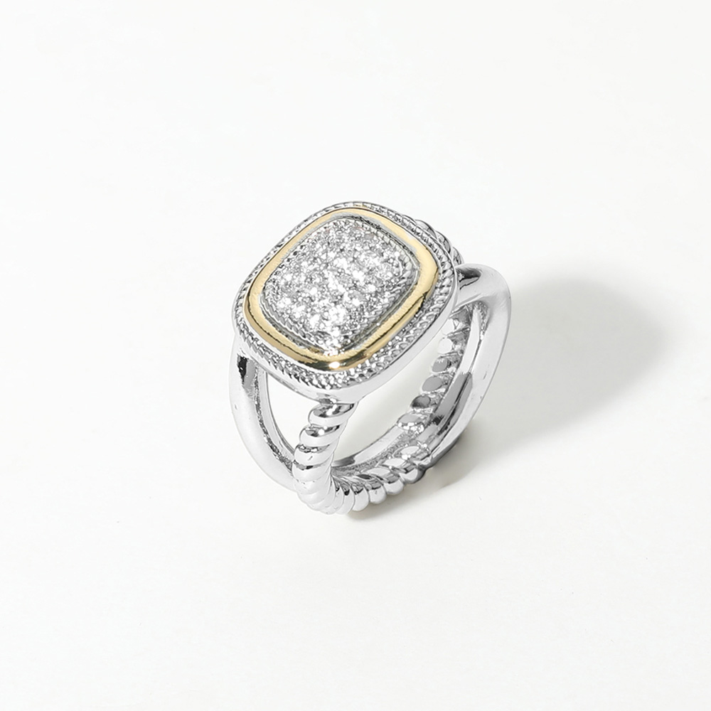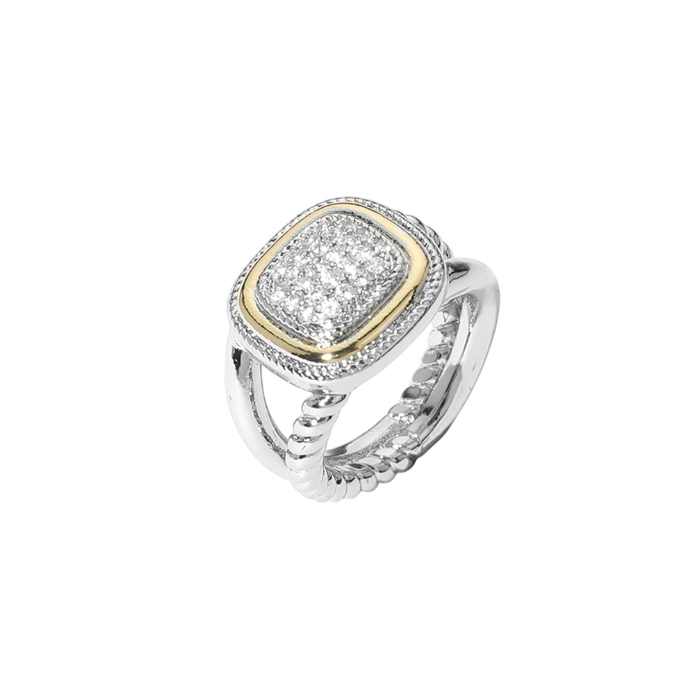 Details • Size : 0.7" H • Sparkling cushion cut CZ ring with a two-tone detailed band. A perfect blend of classic and modern style. Durable, hypoallergenic, and ideal for special occasions or stylish everyday wear. • CZ Cubic Zirconia