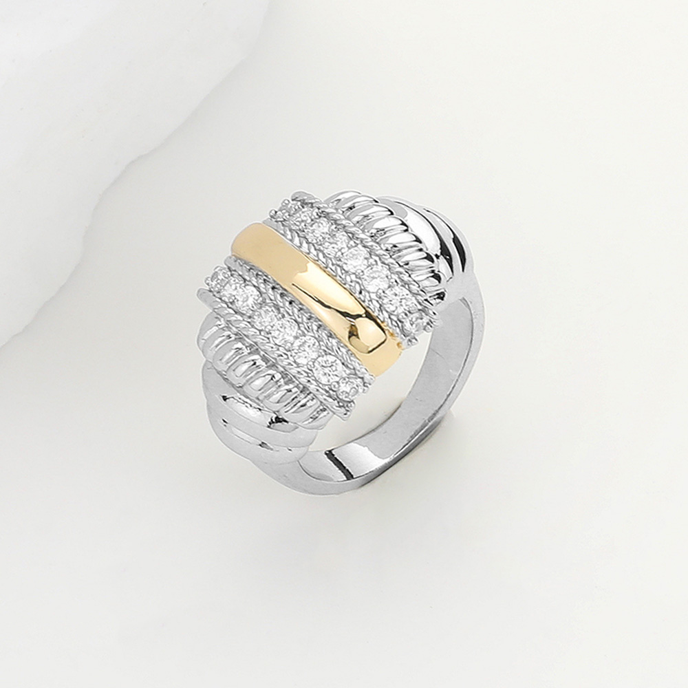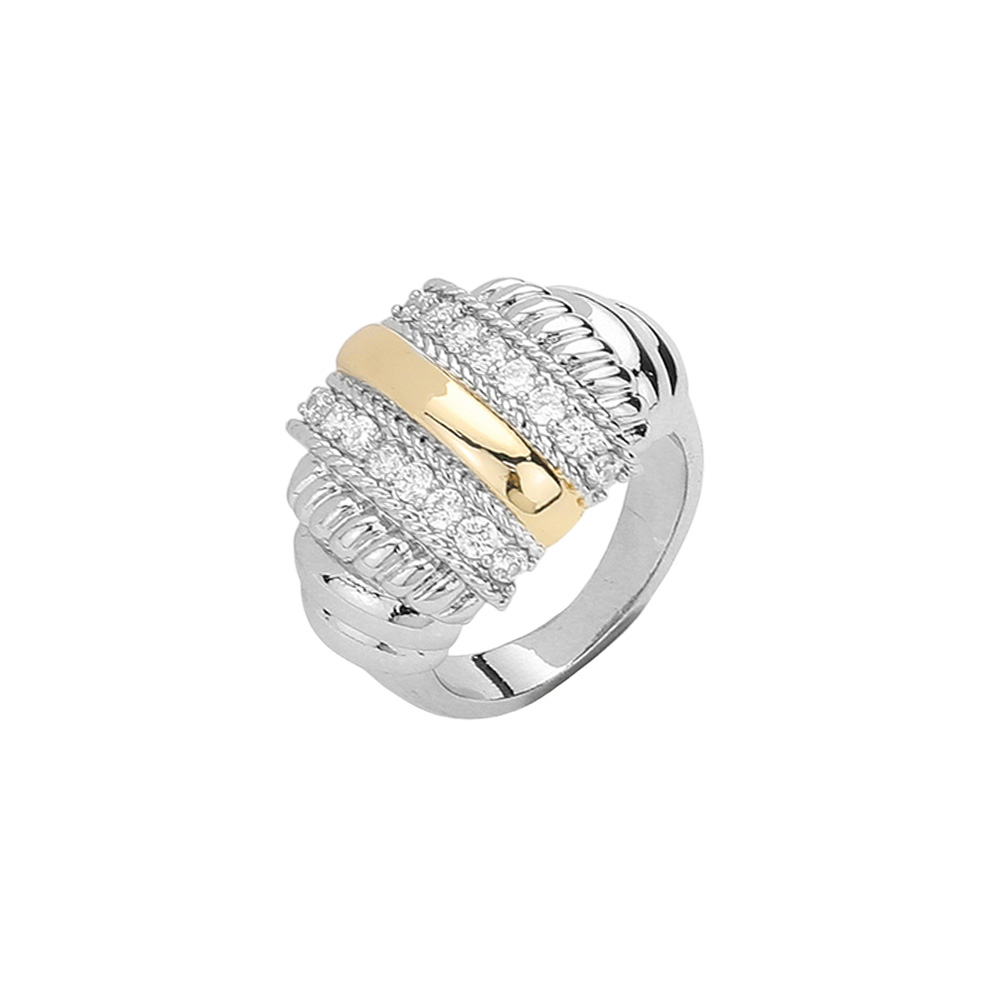Details • Size : 0.7" H • Elevate your look with this bold two-tone dome ring featuring ribbed detailing and sparkling CZ accents. A high-shine mix of textures perfect for cocktail hour or everyday glam. • CZ Cubic Zirconia
