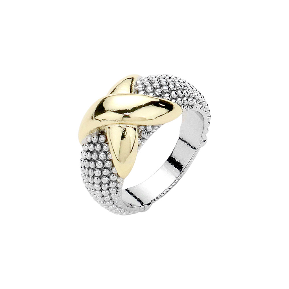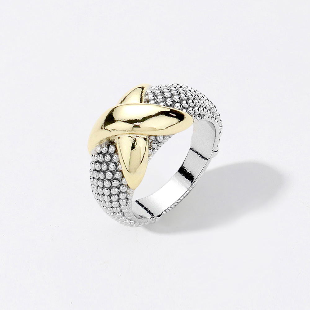 Details • Size : 0.5" H • Make a modern statement with this two-tone crossover ring featuring a bold gold accent and textured silver detailing. A versatile piece perfect for daily wear, evening looks, or gifting to someone who loves stylish and elegant jewelry.