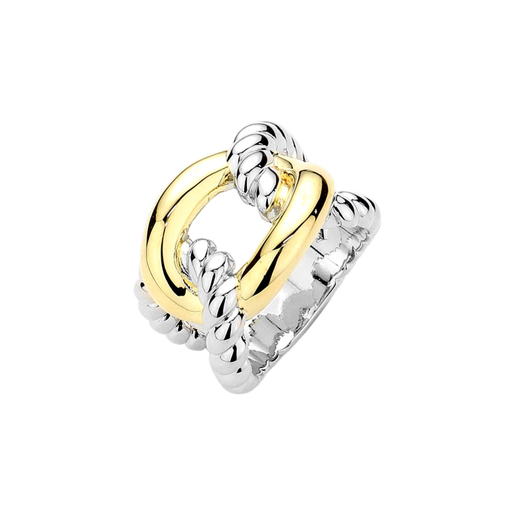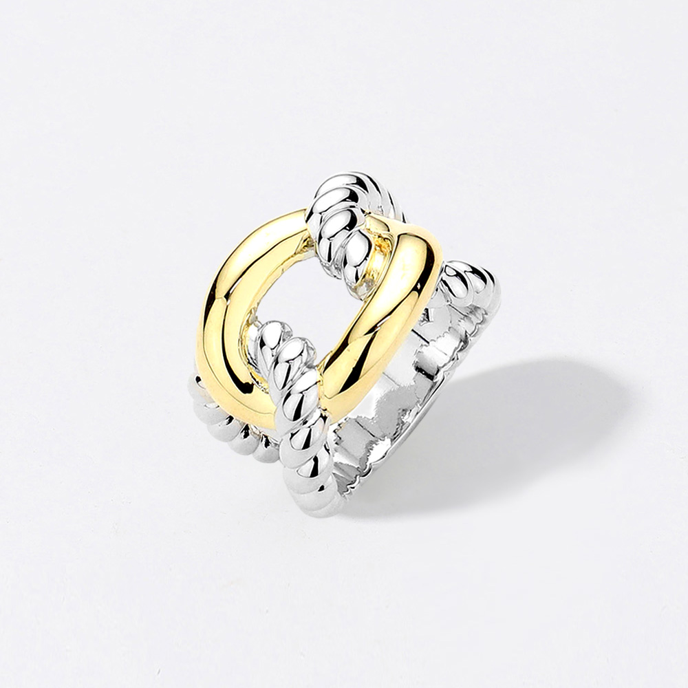 Details • Size : 0.7" H • Add modern elegance to your look with this two-tone interlocking band ring featuring a mix of smooth and textured finishes. A versatile jewelry piece perfect for daily wear, layering, or gifting to someone who loves chic and timeless accessories.