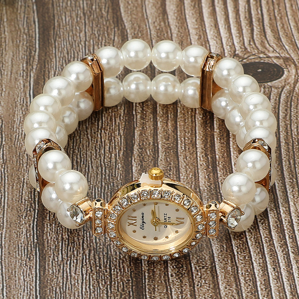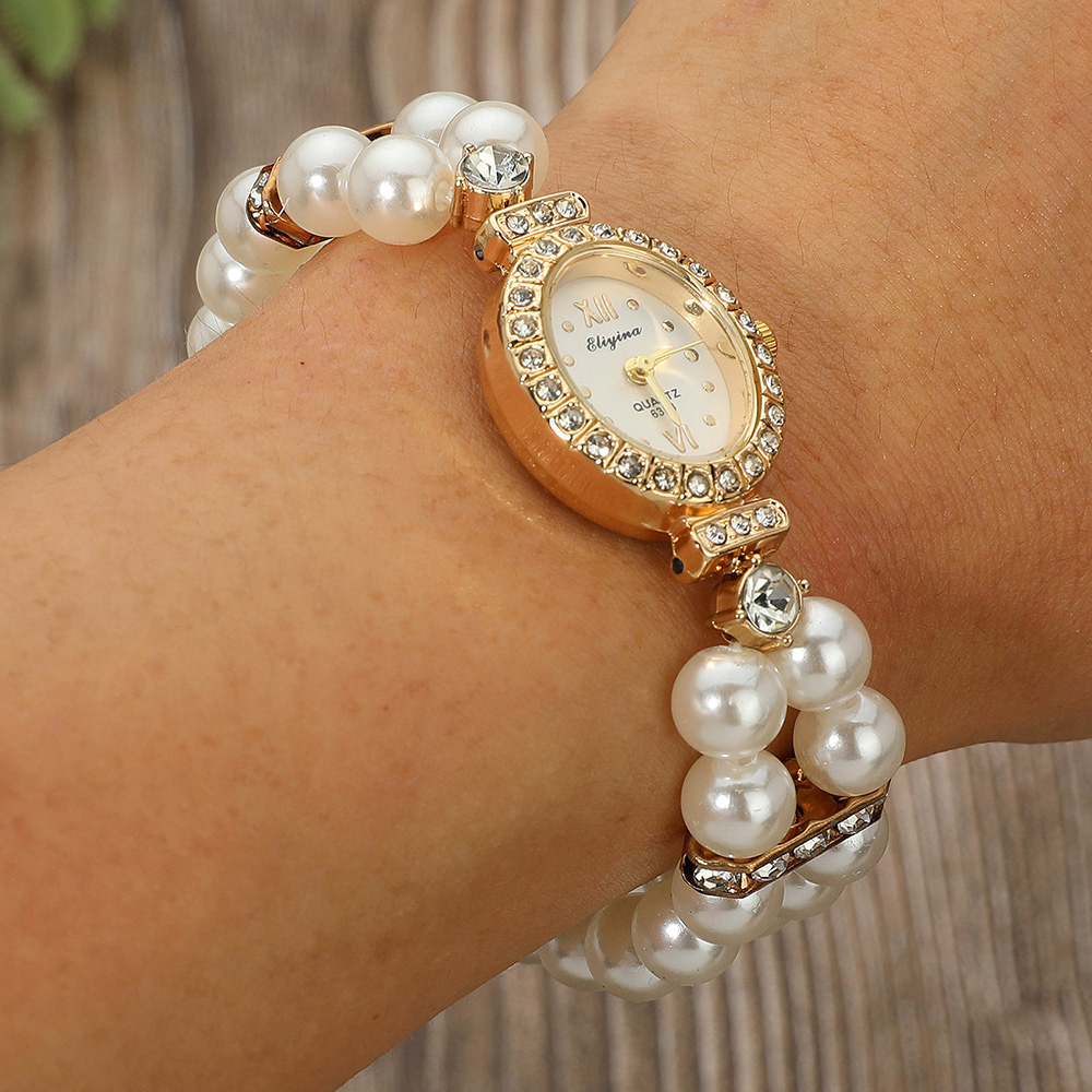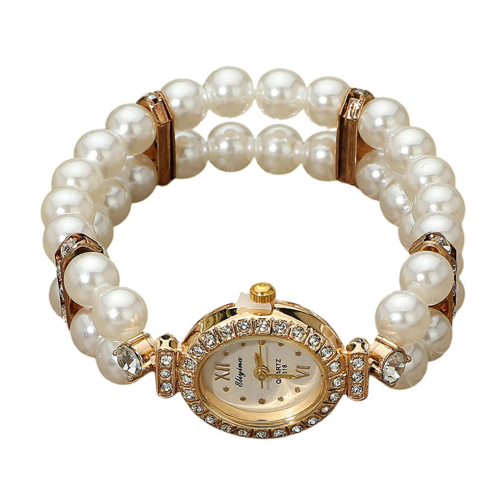 Details • Size : 0.8" H • Stretchable • Elegant bracelet watch with twin rows of pearl beads and an oval-shaped bezel encrusted with sparkling crystals. Combines timeless charm with refined design, perfect for enhancing any sophisticated outfit. • Stainless Steel