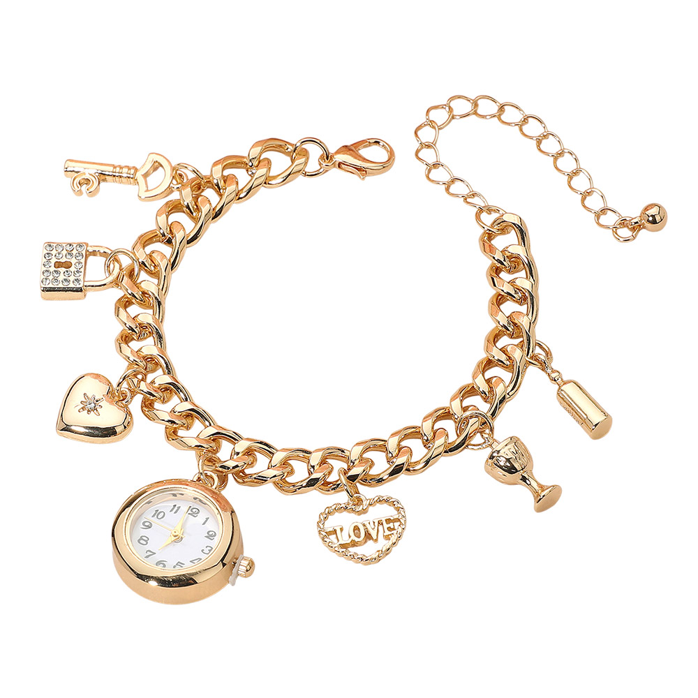 Details • Size : 0.4" H, 7.5" + 3" L • Charm Size : 0.9" L • Lobster Clasp Closure • Add sparkle and romance to your wrist with this love charm bracelet watch. Designed with a polished chain and detailed charms including a heart, key, and goblet, it perfectly blends fashion and function, making it an ideal accessory for both everyday and special occasions. • Sterling Silver Dipped • Lead and Nickel Compliant